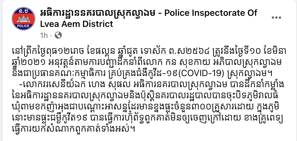 បើយោងតាមការបញ្ជាក់ អធិការដ្ឋាននគរបាលស្រុកល្វាឯម នៅព្រឹកថ្ងៃពុធ១២រោច ខែផល្គុន ឆ្នាំជូត ទោស័ក ព.ស២៥៦៤ ត្រូវនឹងថ្ងៃទី១០ ខែមិនា ឆ្នាំ២០២១ អនុវត្តន៍តាមការបញ្ជាដឹកនាំពីលោក កន សុខកាយ អភិបាលស្រុកល្វាឯម និងជាប្រធានគណៈកម្មាធិការ គ្រប់គ្រងជំងឺកូវីដ-១៩(COVID-19) ស្រុកល្វាឯម។