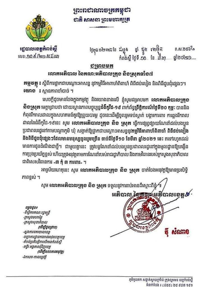 បន្ទាន់! ខេត្តកំពង់ស្ពឺ សម្រេចផ្អាកពិធីអាពាហ៍ពិពាហ៍ និងពិធីជប់លៀងផ្សេងៗបណ្តោះអាសន្ន ដោយសារតែកូវីដ