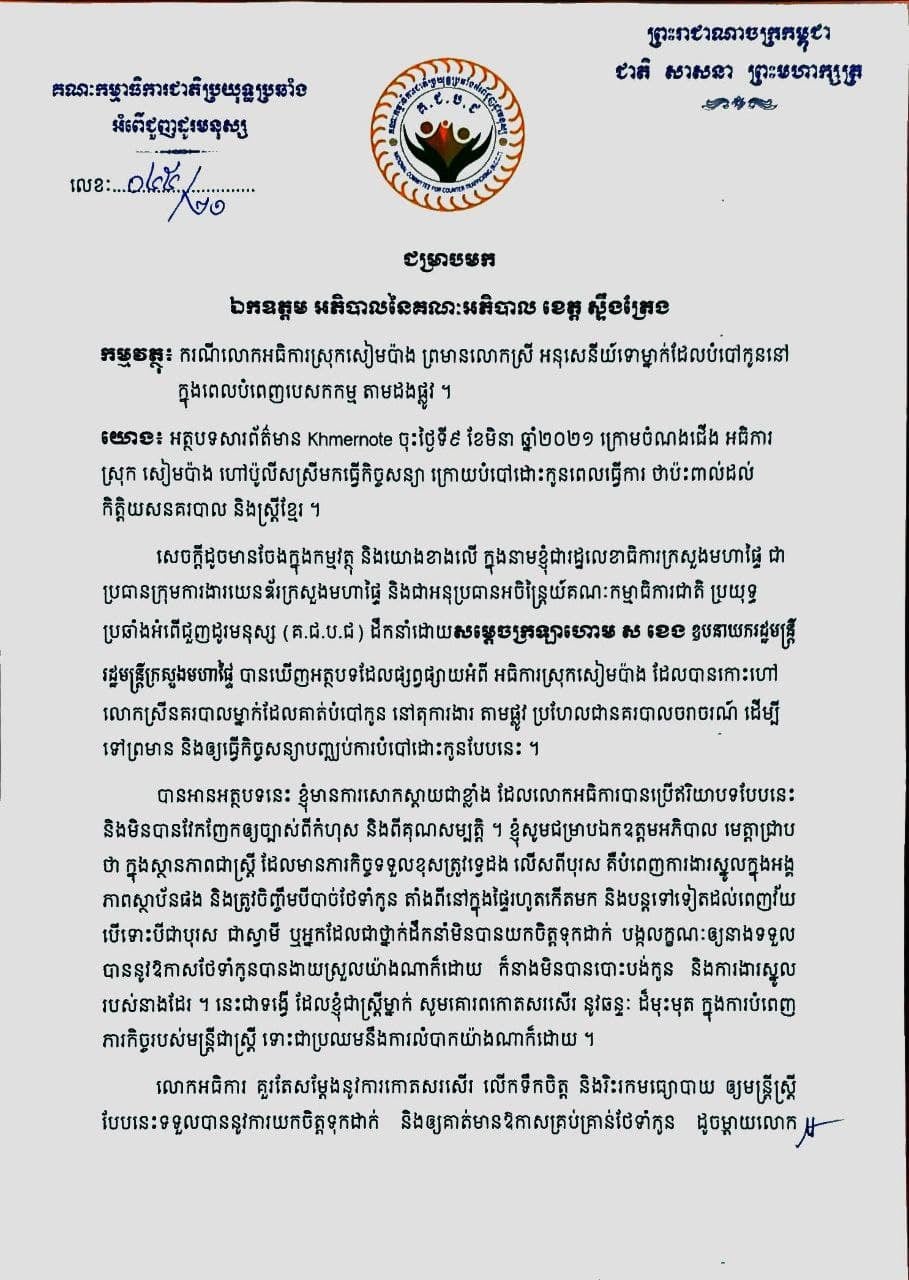 ជុំវិញករណីនេះផងដែរ លោកជំទាវ ជូ ប៊ុនអេង ជារដ្ឋលេខាធិការក្រសួងមហាផ្ទៃ ជាប្រធានក្រុមការងារយេនឌ័រក្រសួងមហាផ្ទៃ និងជាអនុប្រធានអចិន្ត្រៃយ៍គណៈកម្មធិការជាតិ ប្រយុទ្ធប្រឆាំងអំពើជួញដូរមនុស្ស បានសម្តែងការសោកស្តាយយ៉ាងខ្លាំង ដែលលោកអធិការស្រុកសៀមប៉ាង ប្រើឥរិយាបបទបែបនេះ និងមិនបានវែកញែកឲ្យច្បាស់ពីកំហុស និងពីគុណសម្បត្តិ។ លោកជំទាវ ក៏បានសំណូមពរឲ្យលោកអធិការ គួរតែសម្តែងនូវការកោតសរសើរ លើកទឹកចិត្ត និងរិះរកមធ្យោបាយ ឲ្យមន្ត្រីស្ត្រីបែបនេះទទួលបាននូវការយកចិត្តទុកដាក់ និងឲ្យគាត់មានឱកាសគ្រប់គ្រាន់ថែទាំងកូន ដូចម្តាយលោកថែទាំលោកកាលពីនៅទារក និងភរិយាលោកថែទាំងកូនលោកដូចគ្នាដែរ។ សូមអានលិខិតលំអិតខាងក្រោម៖