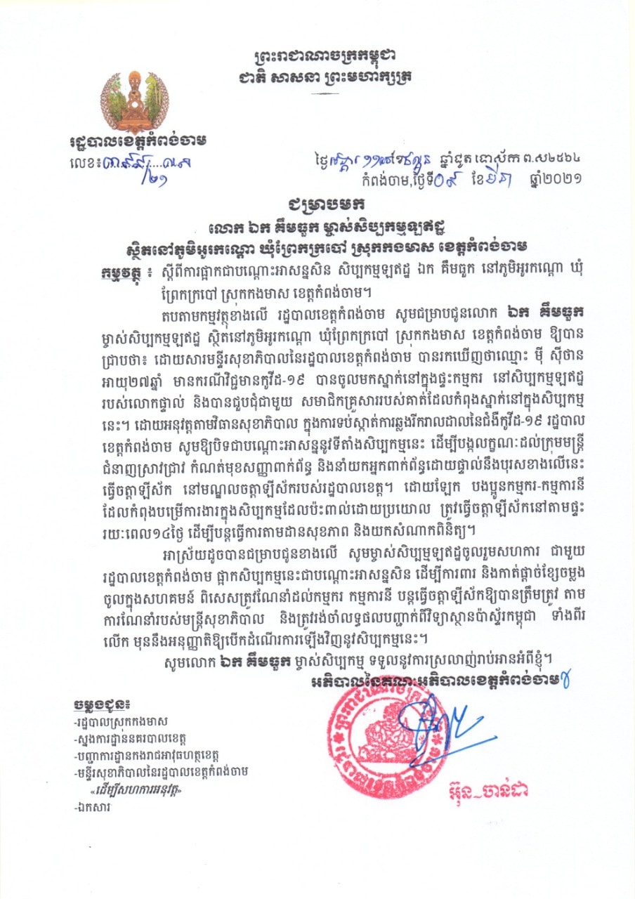ដោយអនុវត្តតាមវិធានការសុខាភិបាល ក្នុងការទប់ស្កាត់ការឆ្លងរីករាលដាលនៃជំងឺកូវីដ១៩ រដ្ឋបាលខេត្តកំពង់ចាម សម្រេចបិទបណ្តោះអាសន្ននូវទីតាំងសិប្បកម្មនេះ ដើម្បីបង្កលក្ខណៈដល់ក្រុមមន្ត្រីជំនាញស្រាវជ្រាវ កំណត់មុខសញ្ញាពាក់ព័ន្ធ និងនាំយកអ្នកពាក់ព័ន្ធដោយផ្ទាល់នឹងបុរសខាងលើទៅធ្វើចត្តាឡីស័ក នៅមណ្ឌលចត្តាឡីស័ករបស់រដ្ឋបាលខេត្ត។