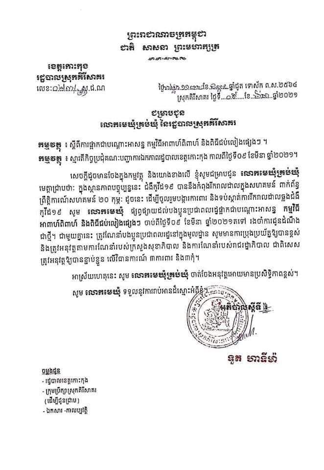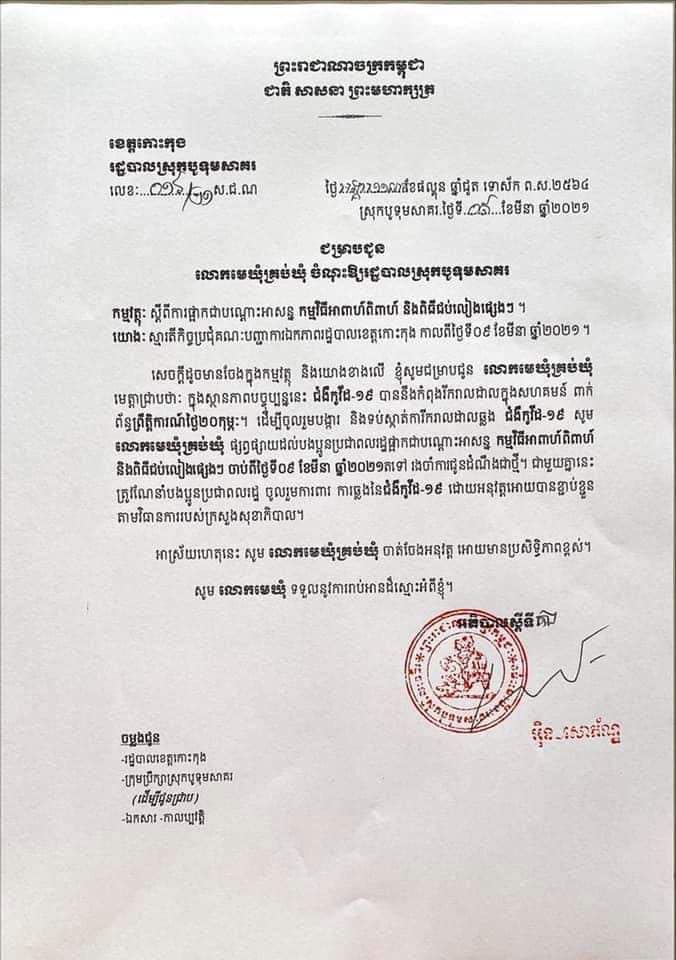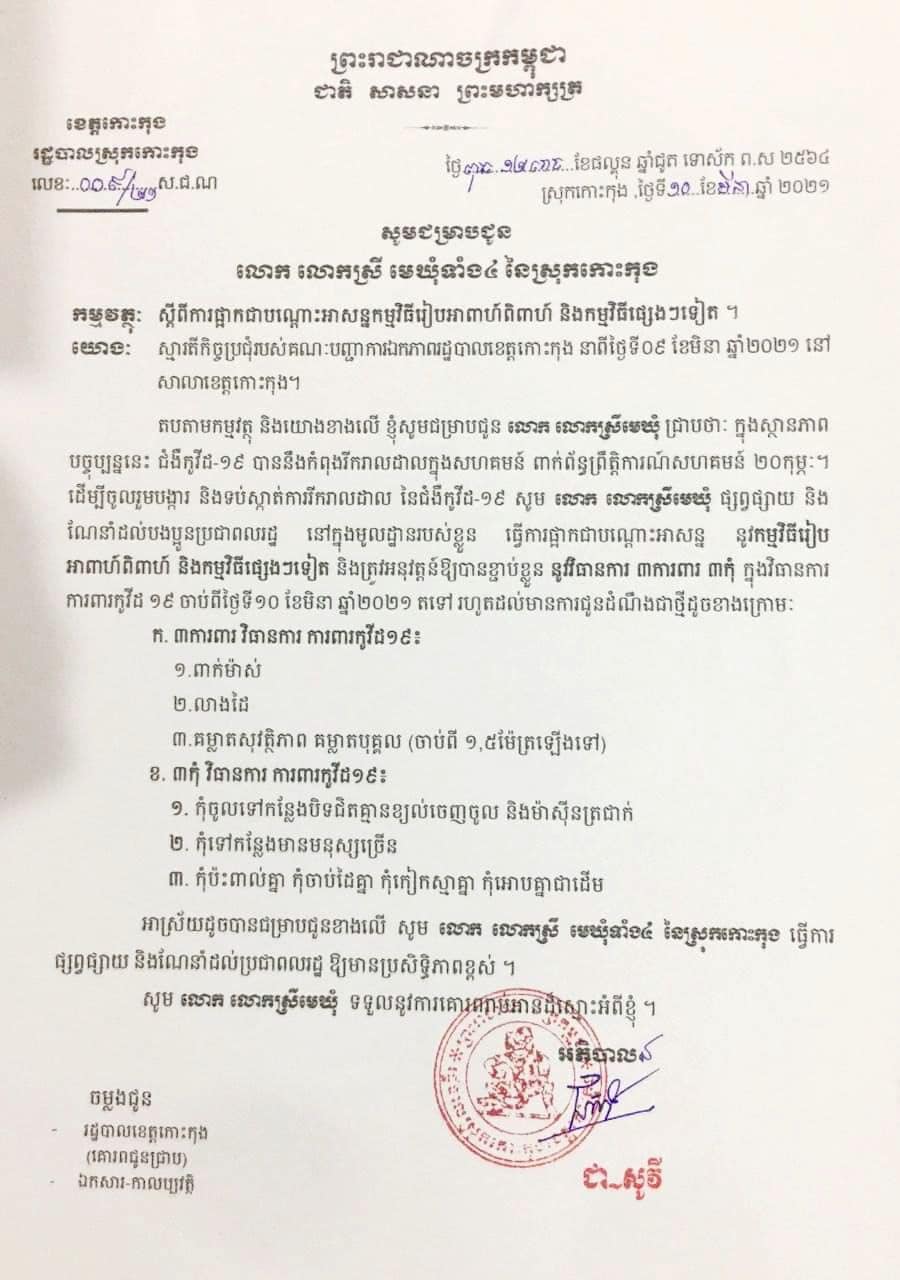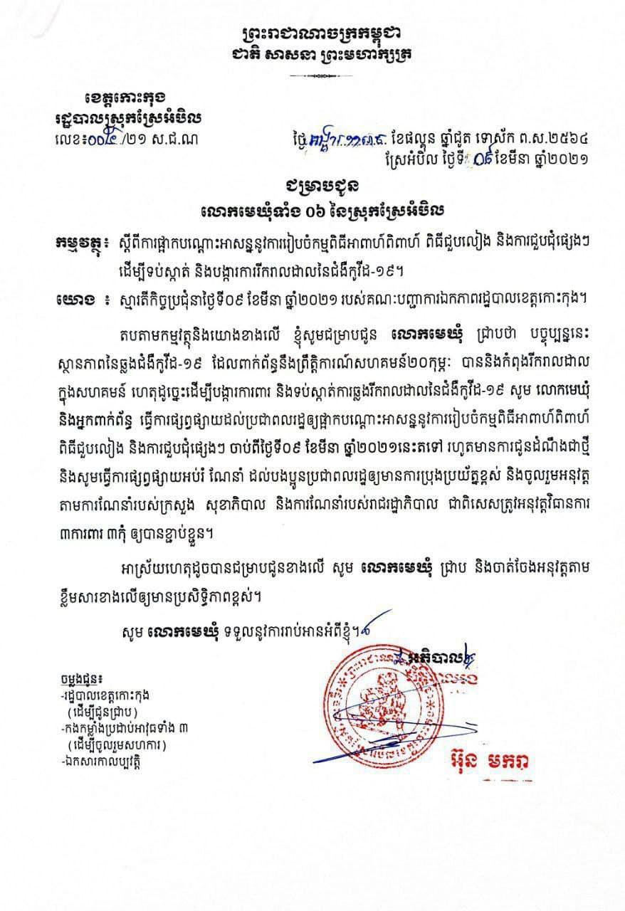 ទូទាំងខេត្តកោះកុង ផ្អាកមិនអោយរៀបចំពិធីមង្គលការ និងជប់លៀងគ្រប់ប្រភេទរហូតដល់មានការជូនដំណឹងឡើងវិញ
