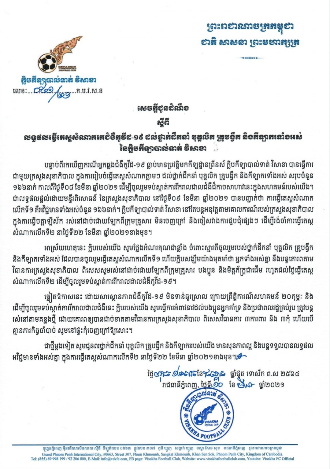 ក្លិបបាល់ទាត់ល្បីឈ្មោះ វិសាខា បានបញ្ជាក់ពីលទ្ធផលធ្វើតេស្តសំណាកដំបូងរបស់ថ្នាក់ដឹកនាំ បុគ្គលិក គ្រូបង្វឹក និងកីឡាករទាំងអស់១៦៦នាក់