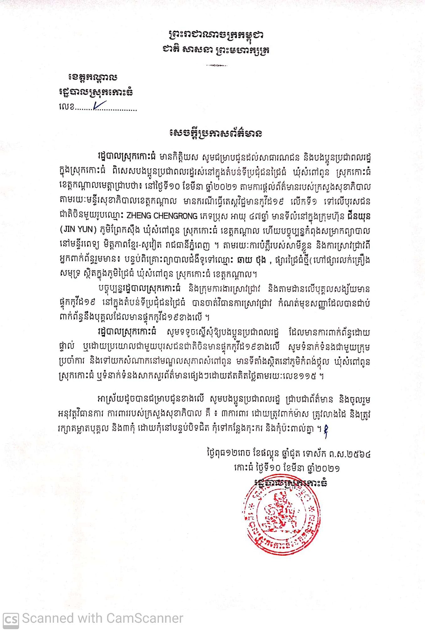 ខេត្តកណ្ដាល៖ តាមការចុះផ្សាយរបស់ រដ្ឋបាលស្រុកកោះធំ បានចេញសេចក្ដីប្រកាសព័ត៌មានជូនដល់សាធារណជន និងបងប្អូនប្រជាពលរដ្ឋក្នុងស្រុកកោះធំ ជាពិសេសប្រជាពលរដ្ឋដែលរស់នៅក្នុងតំបន់ទីប្រជុំជនជ្រៃធំ ឃុំសំពៅពូន ស្រុកកោះធំ ខេត្តកណ្ដាលមេត្តាជ្រាបថា៖ នៅថ្ងៃទី១០ ខែមីនា ឆ្នាំ២០២១ តាមការផ្ដល់ព័ត៌មានរបស់ក្រសួងសុខាភិបាល តាមរយៈមន្ទីរសុខាភិបាលខេត្តកណ្ដាល មានករណីធ្វើតេស្តវិជ្ជមានកូវីដ១៩ លើកទី១ ទៅលើបុរសជនជាតិចិនមួយរូបមានឈ្មោះ ZHENG CHNGRONG ភេទប្រុស អាយុ ៤៧ឆ្នាំ មានទីលំនៅក្នុងក្រុមហ៊ុន ជីនយុន ភូមិព្រែស៊ឹង ឃុំសំពៅពូន ស្រុកកោះធំ ខេត្តកណ្ដាល ហើយបច្ចុប្បន្នកំពុងសម្រាកនៅមន្ទីរពេទ្យ មិត្តភាពខ្មែរ-សូវៀត រាជធានីភ្នំពេញ។