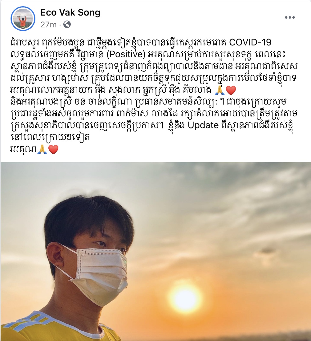 នៅថ្ងៃទី១១ ខែមីនា ឆ្នាំ២០២១ លទ្ធផលបានចេញមកគឺលោកមានវិជ្ជមានកូវីដ-១៩ ហើយលោកបានរៀបរាប់ថា៖ “ជំរាបសួរ ពុកម៉ែបងប្អូន ជាថ្មីម្តងទៀតខ្ញុំបាទបានធ្វេីតេស្តរកមេរោគ COVID-19 លទ្ធផលចេញមកគឺ វិជ្ជាមាន (Positive) អរគុណសម្រាប់ការសួរសុខទុក្ខ ពេលនេះស្ថានភាពជំងឺរបស់ខ្ញុំ ក្រុមគ្រូពេទ្យជំនាញកំពុងព្យាបាលនិងតាមដាន អរគុណជាពិសេសដល់គ្រួសារ ហង្សមាស គ្រុបដែលបានយកចិត្តទុកជួយសម្រួលក្នុងការមេីលថែទាំខ្ញុំបាទ អរគុណលោកអគ្គនាយក អ៉ឹង សុងលាភ អ្នកស្រី អ៉ឹង គីមលាង និងអរគុណបងស្រី ចន ចាន់លក្ខិណា ប្រធានសមាគមន៍សិល្ប: ។ ជាចុងក្រោយសូមប្រជារដ្ឋទាំងអស់ចូលរួមការពារ ពាក់ម៉ាស លាងដៃ រក្សាគំលាតអោយបានត្រឹមត្រូវតាមក្រសួងសុខាភិបាលបានចេញសេចក្តីប្រកាស។ ខ្ញុំនិង Update ពីស្ថានភាពជំងឺរបស់ខ្ញុំនៅពេលក្រោយៗទៀត អរគុណ”៕
