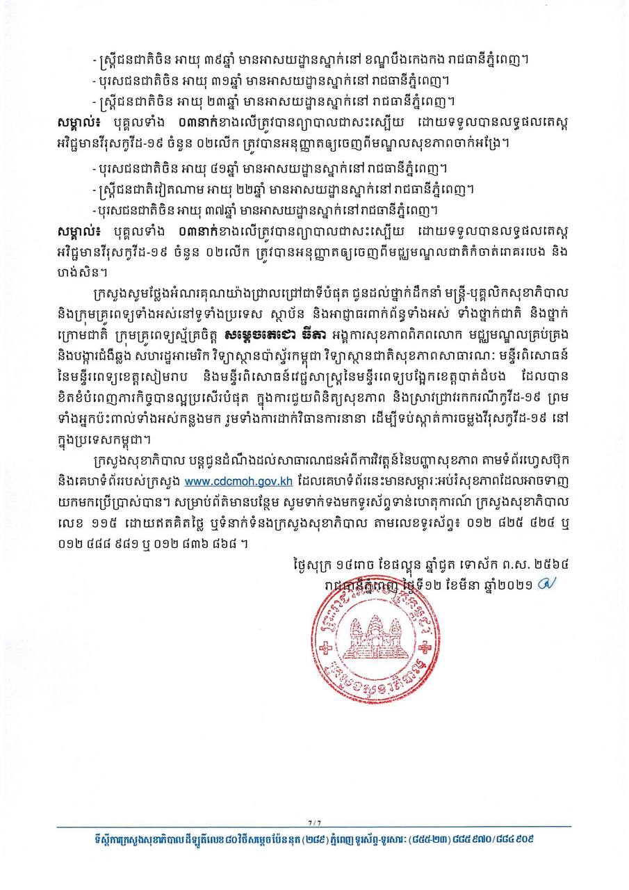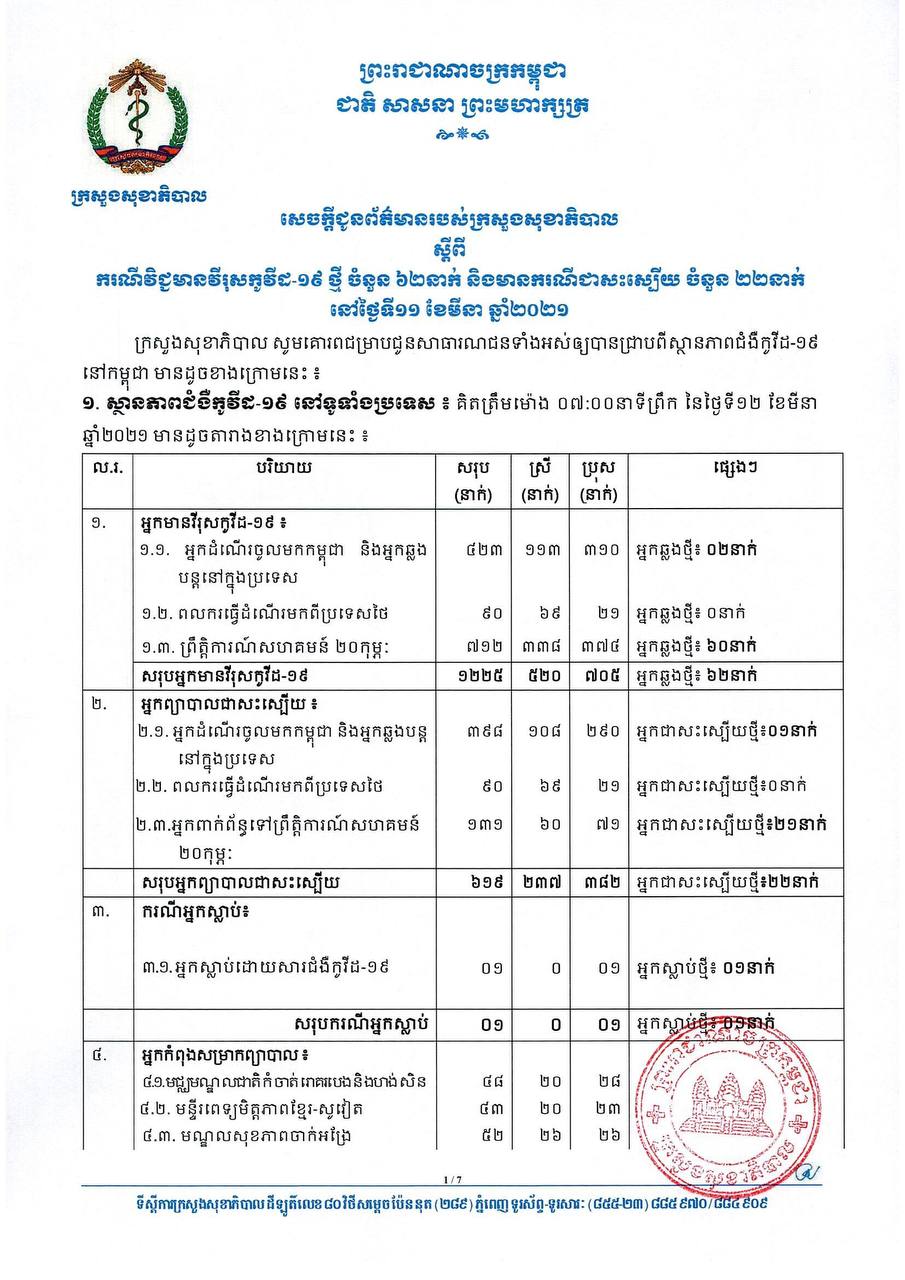 នៅព្រឹកថ្ងៃទី១២ ខែមីនា ឆ្នាំ២០២១នេះ ក្រសួងសុខាភិបាលកម្ពុជា បានចេញសេចក្តីជូនដំណឹងពី ការរកឃើញករណីវិជ្ជមានវីរុសកូវីដ១៩ថ្មី ចំនួន៦២នាក់ និងមានករណីជាសះស្បើយថ្មី២២នាក់ផងដែរ។