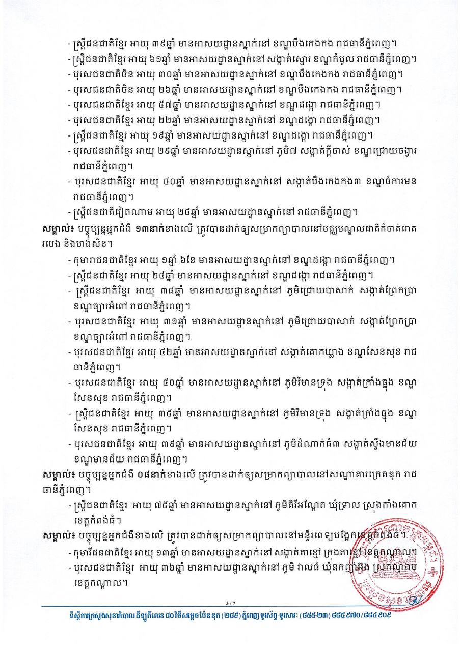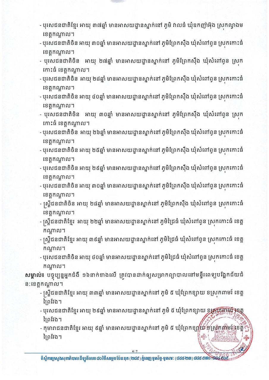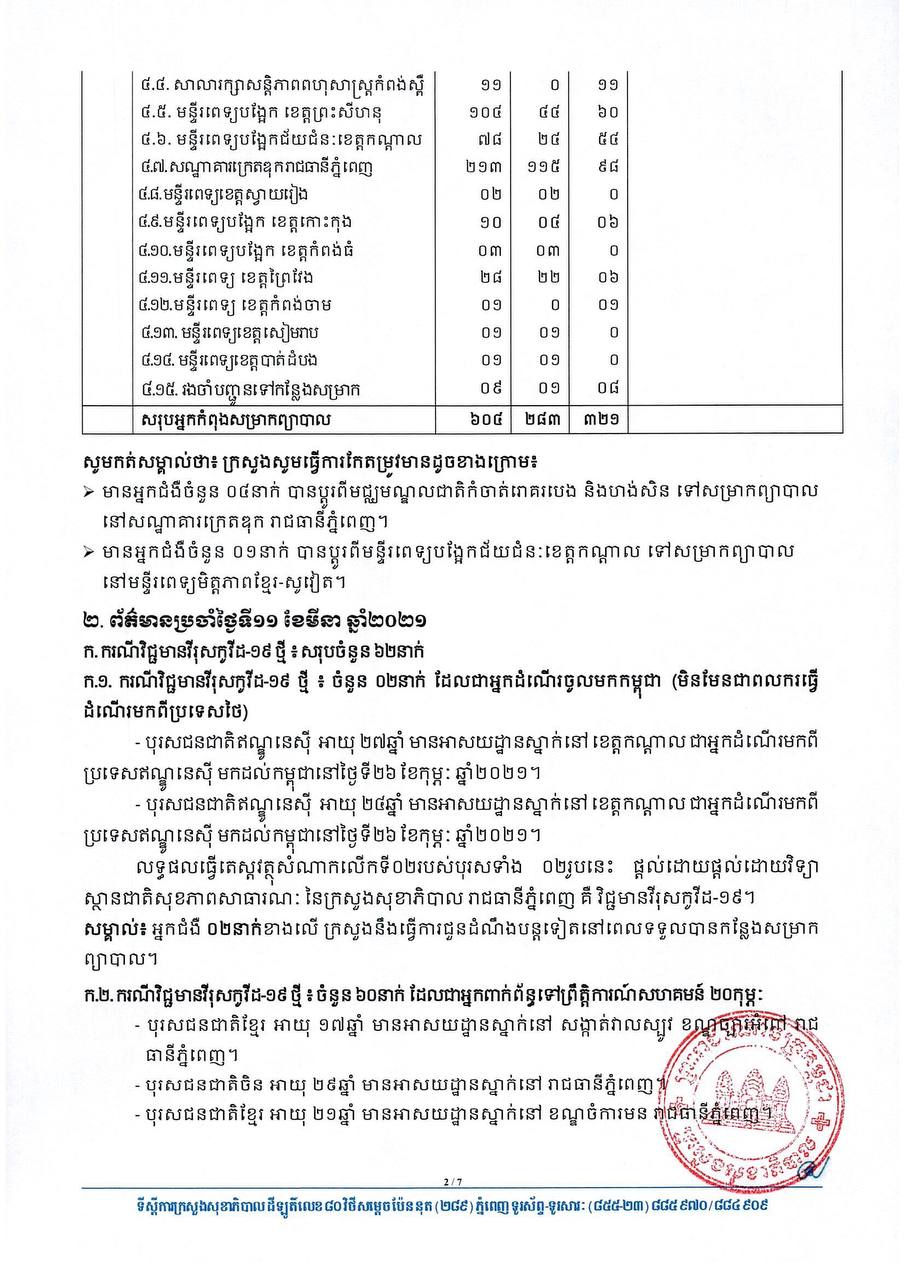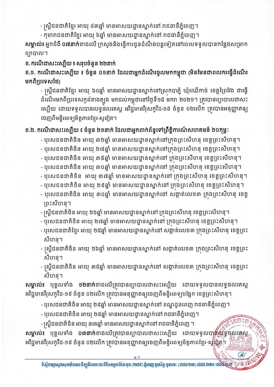 យោងតាមសេចក្តីប្រកាសរបស់ក្រសួងសុខាភិបាល បានបញ្ជាក់ថា អ្នកវិជ្ជមានទាំង៦២នាក់នោះ មាន៦០នាក់ គឺជាអ្នកពាក់ព័ន្ធព្រឹត្តិការណ៍ សហគមន៍២០កុម្ភៈ និង២នាក់ទៀតជាអ្នកដំណើរចូលមកកម្ពុជា។ ចំណែកឯអ្នកជាសះស្បើយទាំង២២នាក់ មាន២១នាក់ ជាអ្នកពាក់ព័ន្ធព្រឹត្តិការណ៍ សហគមន៍២០កុម្ភៈ និងម្នាក់ទៀតជាអ្នកដំណើរចូលមកកម្ពុជា។ សូមអានសេចក្តីជូនព័ត៌មាននៅខាងក្រោម៖