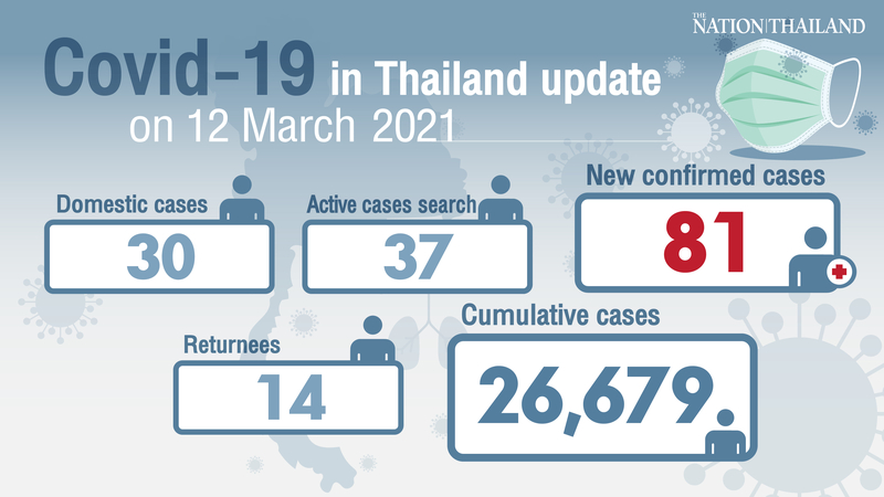 យោងតាមការចុះផ្សាយរបស់សារព័ត៌មាន The Nation Thailand នៅថ្ងៃសុក្រ ទី១២ ខែមីនា ឆ្នាំ២០២១ បានរាយការណ៍ថា ប្រទេសថៃបានរកឃើញអ្នកឆ្លងជំងឺ COVID-19 ថ្មីចំនួន ៨១នាក់ ដោយក្នុងនោះមាន ១១នាក់ ជាពលករខុសច្បាប់ ដែលបានចូលមកប្រទេសថៃតាមព្រំដែនថៃ-ភូមា និង ១៤នាក់ ជាការនាំចូលពីបរទេស។ ពុំមានការស្លាប់ថ្មីត្រូវបានបញ្ជាក់នោះទេ ដូច្នេះការស្លាប់សរុបចាប់តាំងពីប្រទេសនេះមានវត្តមានជំងឺ COVID-19 នៅតែមាន ៨៥ នាក់ដដែល។
