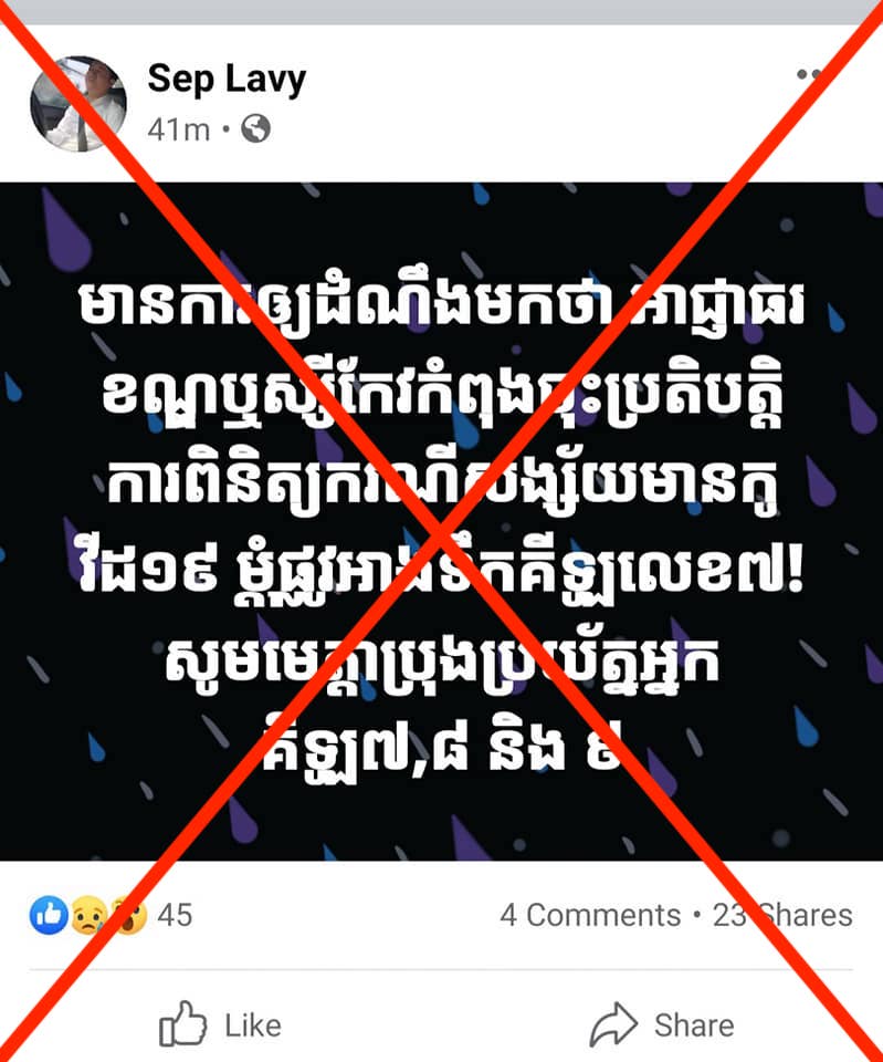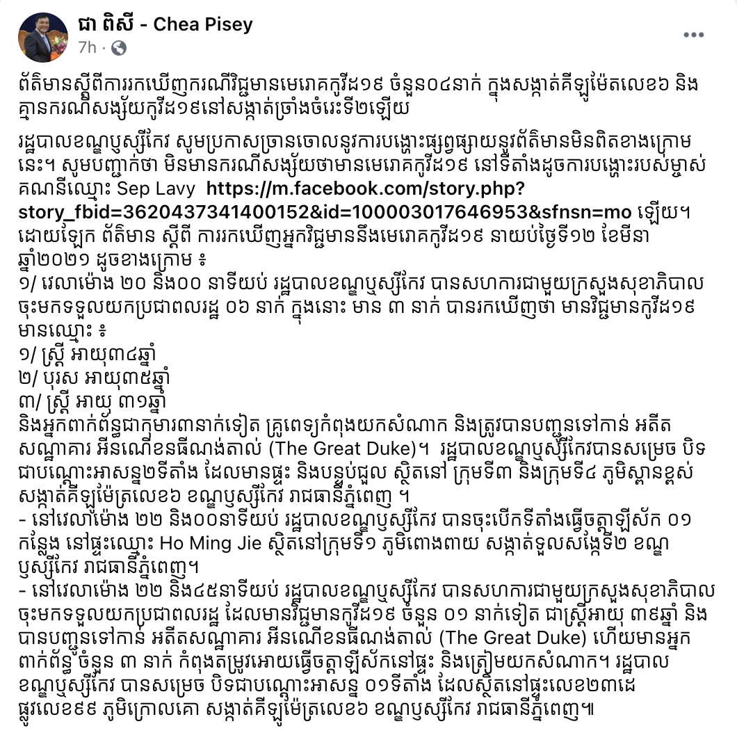 យោងតាមការបញ្ជាក់ពីលោក ជា ពិសី អភិបាលនៃគណៈអភិបាលខណ្ឌប្ញស្សីកែវ នៅលើបណ្តាញសង្គមហ្វេសប៊ុកបានឲ្យដឹងថា កាលពីយប់ថ្ងៃទី១២ ខែមីនា ឆ្នាំ២០២១ រដ្ឋបាលខណ្ឌប្ញស្សីកែវ បានធ្វើការប្រកាសច្រានចោលនូវការបង្ហោះផ្សព្វផ្សាយនូវព័ត៌មានមិនពិតរបស់ម្ចាស់គណនីឈ្មោះ Sep Lavy ដោយរដ្ឋបាលខណ្ឌបញ្ជាក់ថា មិនមានករណីសង្ស័យថាមានមេរោគកូវីដ១៩ នៅទីតាំងដូចការបង្ហោះឡើយ។