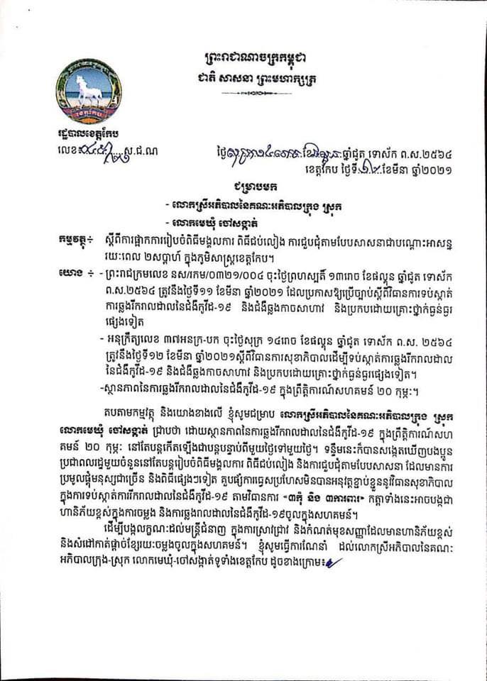 យោងតាមលិខិតពីរដ្ឋបាលខេត្តកែប ដោយសារស្ថានភាពនៃការឆ្លងរីករាលដាលនៃជំងឺកូវីដ១៩ ក្នុងព្រឹត្តិការណ៍ សហគមន៍២០កុម្ភៈ នៅតែបន្តកើនឡើងជាលំដាប់ពីមួយថ្ងៃទៅមួយថ្ងៃ។ ទន្ទឹមនឹងនេះក៏បានសង្កេតឃើញបងប្អូនប្រជាពលរដ្ឋមួយចំនួនតូចនៅតែបន្តរៀបពិធីមង្គលការ ពិធីជប់លៀង និងការជួបជុំតាមបែបសាសនានា ដែលមានការប្រមូលផ្តុំមនុស្សជាច្រើន និងពិធីផ្សេងៗទៀត គួបផ្សំការធ្វេសប្រហែសមិនបានអនុវត្តខ្ជាប់ខ្ជួននូវវិធានការអនាម័យ និងវិធានការទប់ស្កាត់នឹងការរីករាលដាលនៃជំងឺកូវីដ១៩។