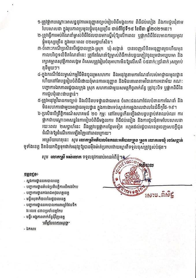 រដ្ឋបាលខេត្តកែប សម្រេចផ្អាកជាបណ្តោះអាសន្ននូវការអនុញ្ញាតច្បាប់សម្រាប់រៀបចំពិធីមង្គលការ ពិធីជប់លៀង និងការជួបជុំបែបសាសនាក្នុងរូបភាពប្រមូលផ្តុំមនុស្សច្រើន ចាប់ពីថ្ងៃទី១៥ ខែមីនា ឆ្នាំ២០២១ ហើយក្នុងករណីម្ចាស់ពិធីមិនចូលរួមសហការ និងអនុវត្តតាមការណែនាំរបស់ក្រសួងសុខាភិបាលនៅតែបន្តរៀបចំពិធីដោយពុំមានការអនុញ្ញាត និងមិនគោរពតាមវិធានការអនាម័យ គណៈបញ្ជាការឯកភាពរដ្ឋបាលក្រុង-ស្រុក ត្រូវចុះបិទ ឬផ្អាកពិធី នៃការជួបជុំនោះជាបន្ទាន់។ សូមអានព័ត៌មានលំអិតខាងក្រោម៖