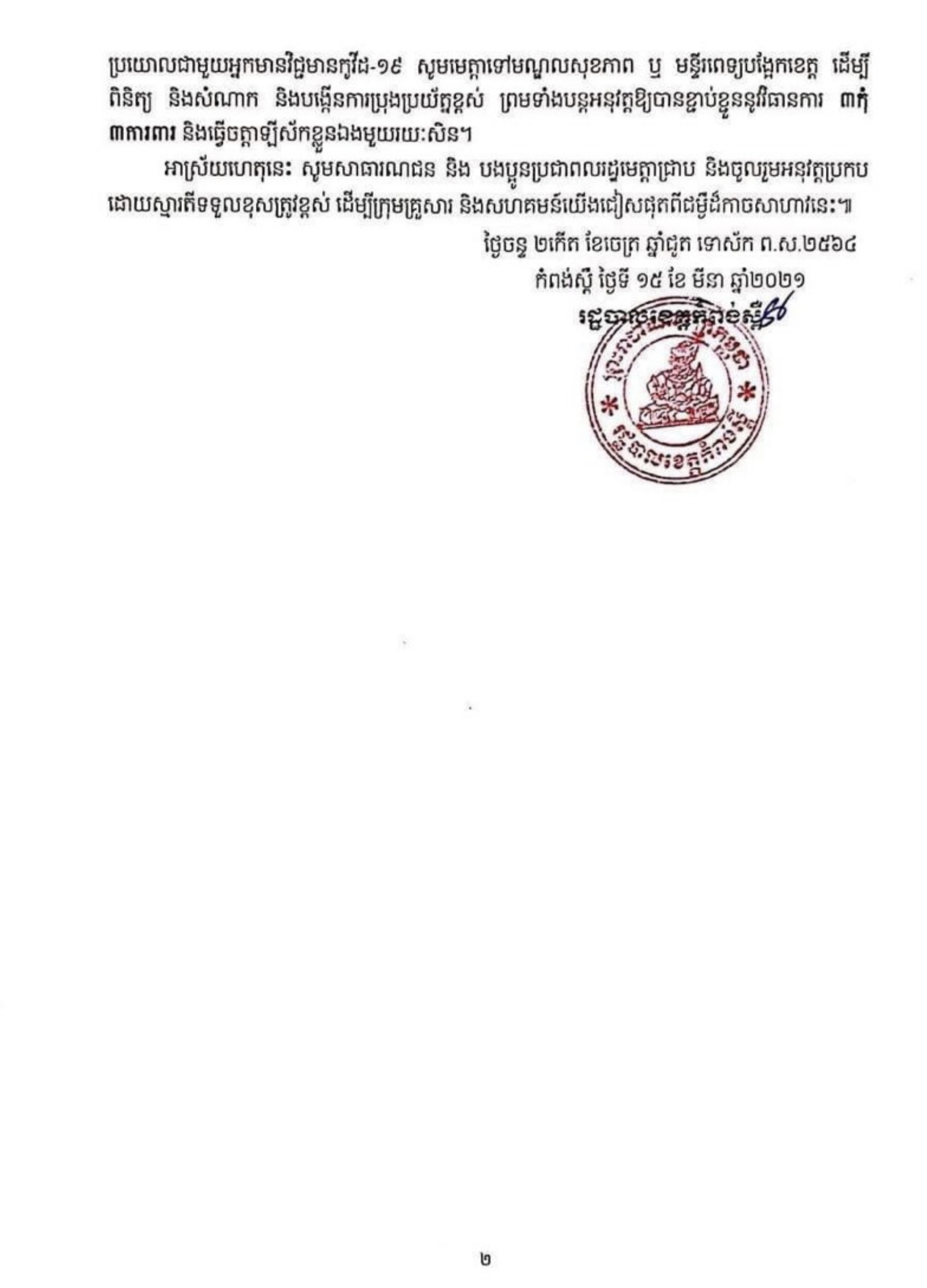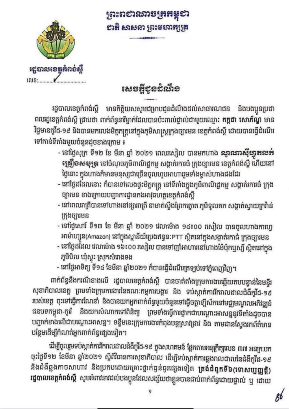 យោងតាមសេចក្តីជូនដំណឹងមួយរបស់រដ្ឋបាលខេត្តកំពង់ស្ពឺ បានអោយដឹងថា អាជ្ញាធរបានសម្រេចផ្អាកបណ្តោះអាសន្នទីទាំងចំនួន៥កន្លែង ពាក់ព័ន្ធនារីម្នាក់ដែលបានប៉ះពាល់ផ្ទាល់ជាមួយបុគ្គលឈ្មោះ កក្កដា សោភ័ណ្ឌ មានវិជ្ជមានកូវីដ-១៩ និងបានមកលេងមិត្តភក្ត្រនៅក្នុងភូមសាស្ត្រក្រុងច្បារមន ខេត្តកំពង់ស្ពឺ។