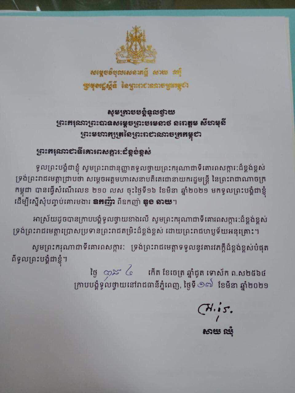 ក្នុងលិខិតក្រាបទូលថ្វាយ ព្រះមហាក្សត្រនេះដែរបានបញ្ជាក់អោយដឹងថា សម្តេចអគ្គមហាសេនាបតីតេជោនាយករដ្ឋមន្ត្រី នៃព្រះរាជាណាចក្រកម្ពុជា បានធ្វើសំណើលេខ២១០ លស ចុះថ្ងៃទី១៦ ខែមីនា ឆ្នាំ២០២១ ទៅកាន់សម្តេចប្រមុខរដ្ឋស្តីទី ដើម្បីស្នើសុំបញ្ចប់គោរមងារ ឧកញ៉ា ពី ឧកញ៉ា ឌួង ឆាយ។ អាស្រ័យដូចនេះ សម្តេចប្រមុខរដ្ឋស្តីទី បានធ្វើលិខិតក្រាបបង្គំទូលថ្វាយ ព្រះមហាក្សត្រ សូមព្រះករុណាជាទីគោរពសក្ការៈ ទ្រង់ព្រះរាជមេត្តាប្រោសប្រទានព្រះរាជតម្រិះដ៏ខ្ពង់ខ្ពស់ ដោយព្រះរាជហឫទ័យអនុគ្រោះ៕