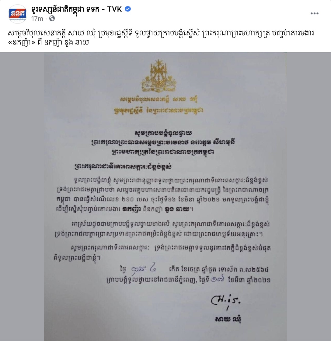 នៅមុននេះបន្តិចសម្តេចវិបុលសេនាភក្តី សាយ ឈុំ ប្រមុខរដ្ឋស្តីទី ទូលថ្វាយក្រាបបង្គំស្នើសុំ ព្រះករុណាព្រះមហាក្សត្រ បញ្ចប់គោរមងារ «ឧកញ៉ា» ពី ឧកញ៉ា ឌួង ឆាយ ដែលលិខិតនេះត្រូវបានផ្សព្វផ្សាយបណ្តាញសង្គម និងទូរទស្សន៍ជាតិកម្ពុជា ផងដែរ។