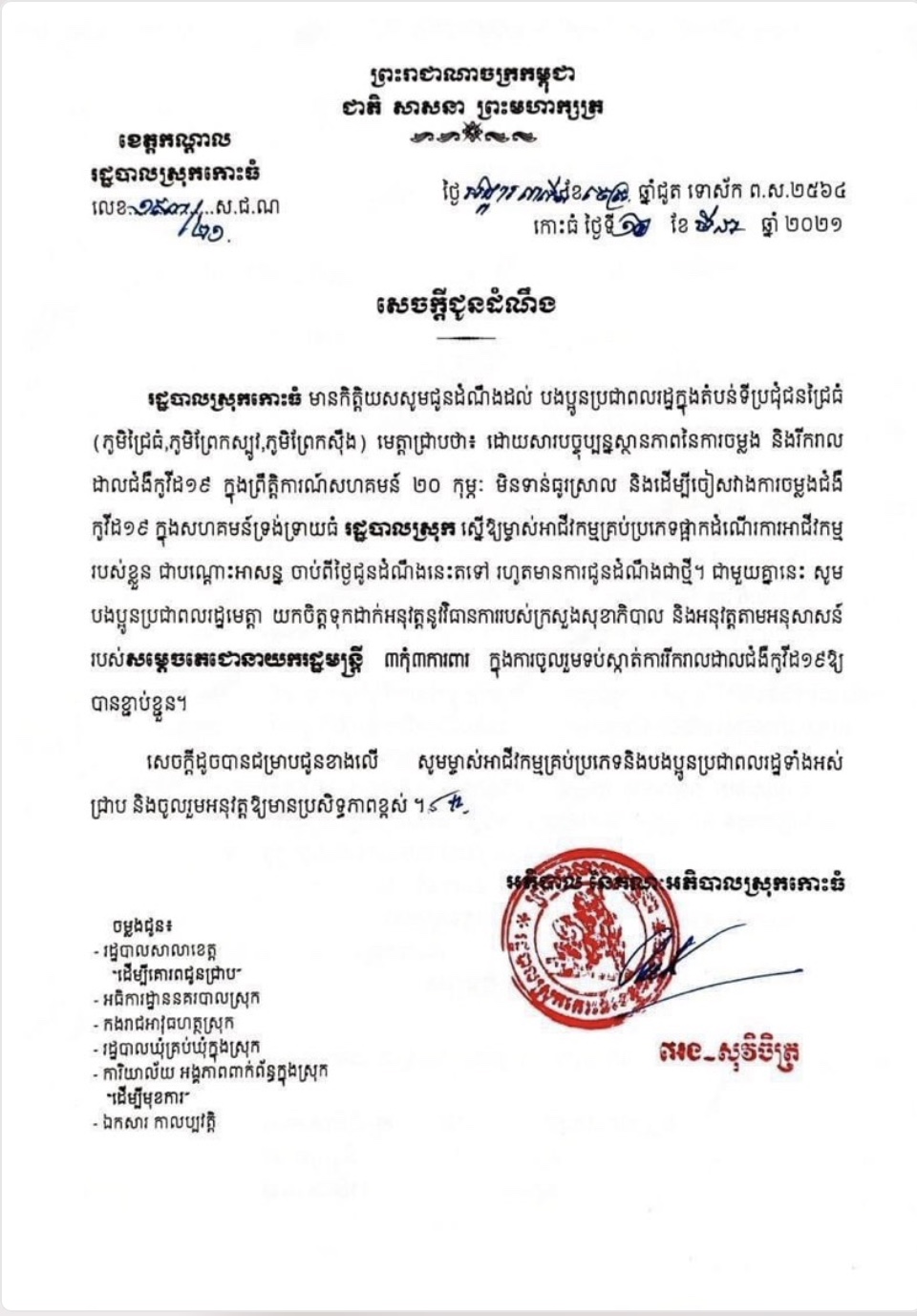 ករណីទី១ ដែលអាជ្ញាធរស្រុកកោះធំ ចេញសេចក្តីជូនដំណឹងអោយផ្អាកដំណើរការអាជីវកម្មគ្រប់ប្រភេទ ក្នុងភូមិសាស្ត្រផ្ទុះការរាលដាលជំងឺកូវីដ-១៩