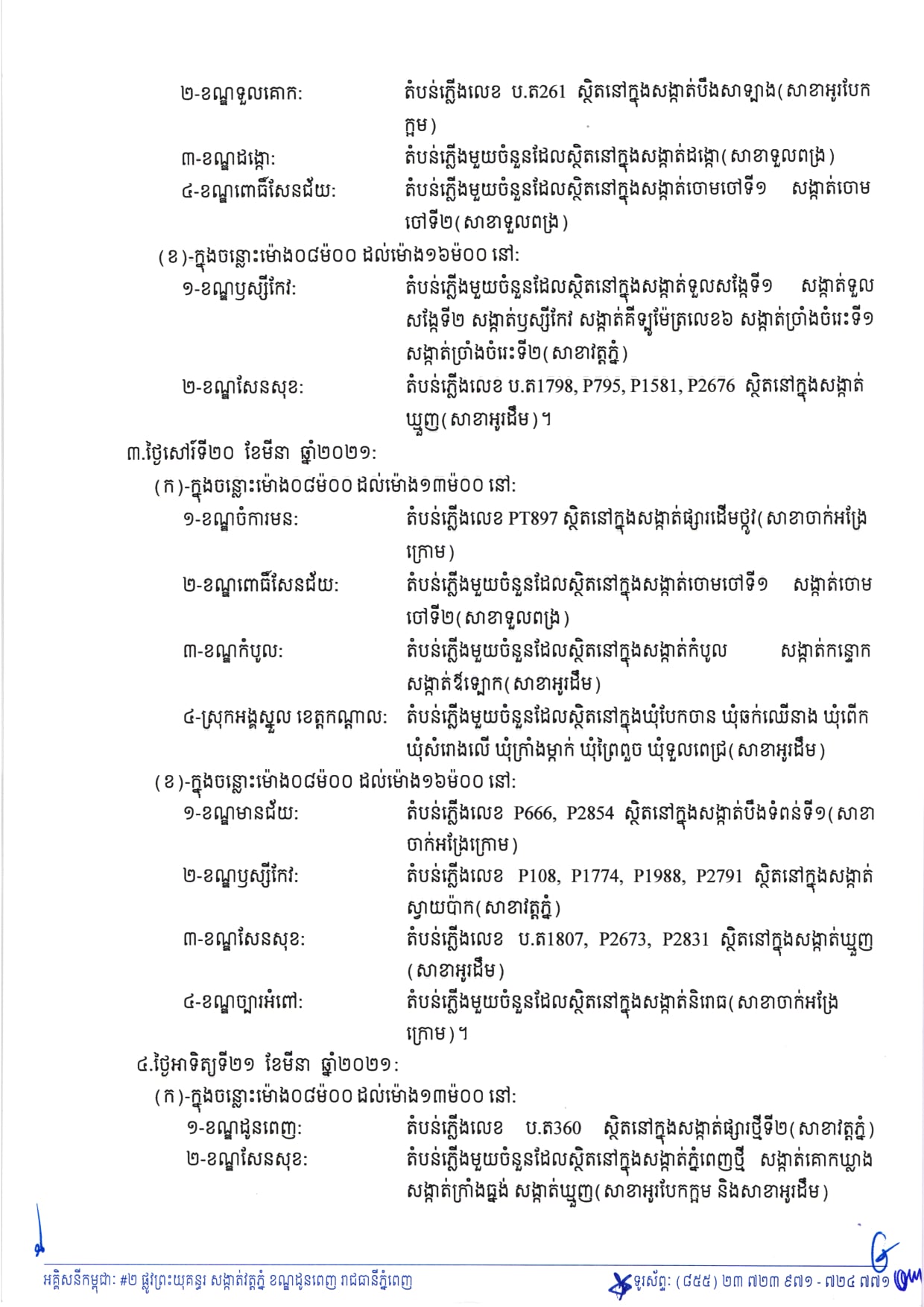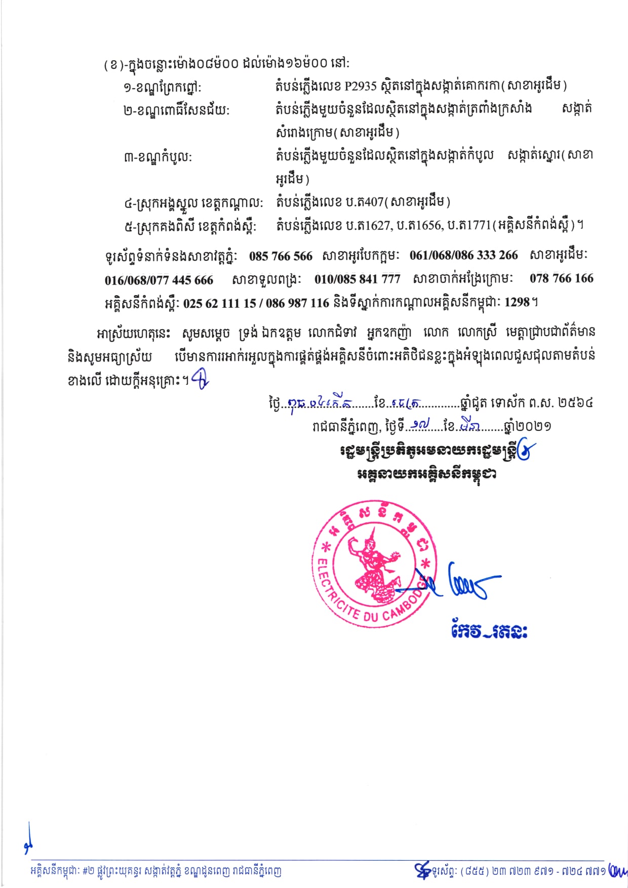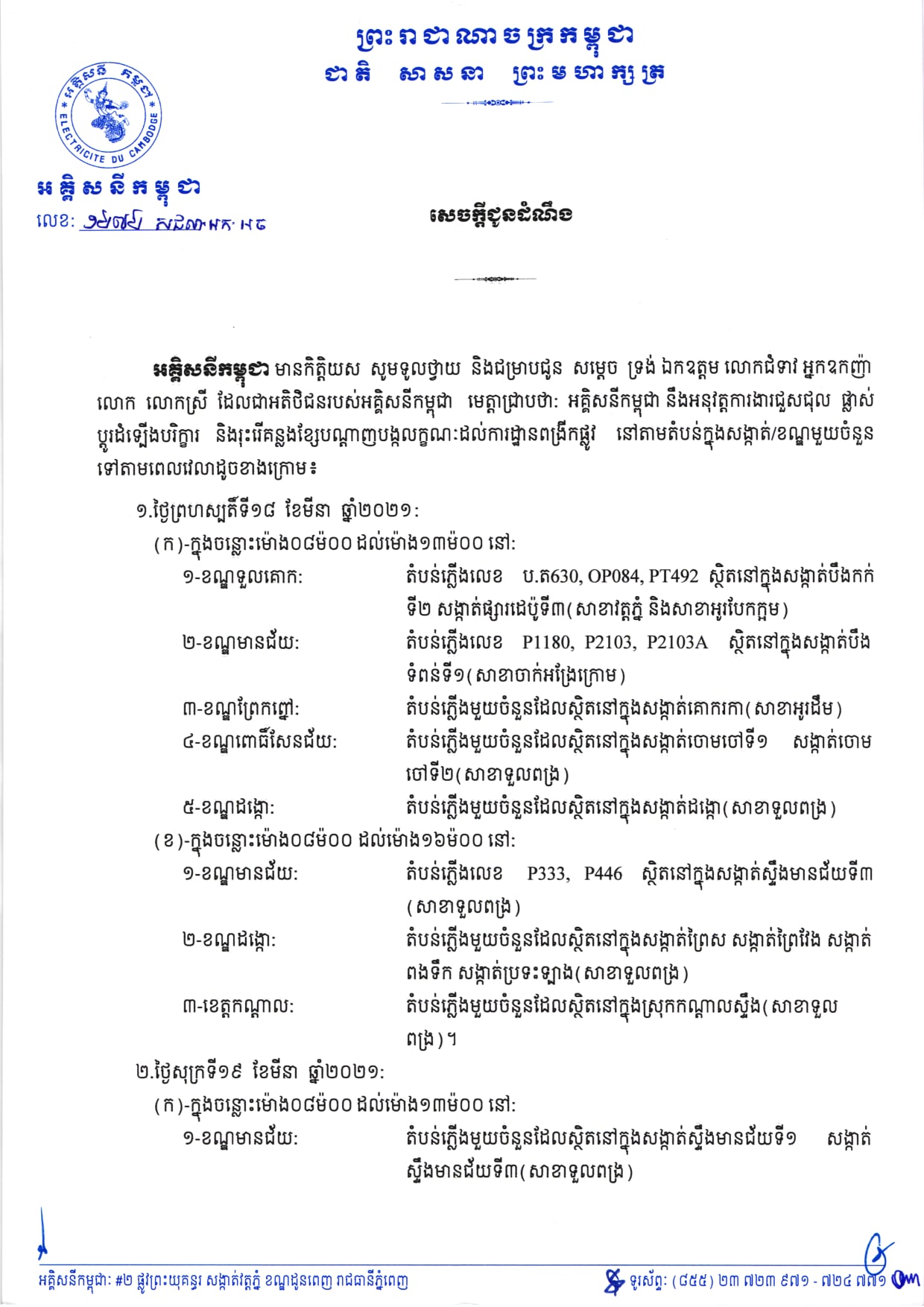 រាជធានីភ្នំពេញ៖ យោងតាមការចុះផ្សាយរបស់ អគ្គិសនីកម្ពុជា – EDC នៅថ្ងៃពុធ ៤កើត ខែចេត្រ ឆ្នាំជូត ទោស័ក ព.ស.២៥៦៤ ត្រូវនឹងថ្ងៃទី១៧ ខែមីនា ឆ្នាំ២០២១ កាលពីម្សិលមិញនេះ បានចេញសេចក្តីជូនដំណឹងស្តីពីការអនុវត្តការងារជួសជុល ផ្លាស់ប្តូរ តម្លើងបរិក្ខារនានា និងរុះរើគន្លងខ្សែបណ្តាញអគ្គិសនីរបស់អគ្គិសនីកម្ពុជា ដើម្បីបង្កលក្ខណៈងាយស្រួលដល់ការដ្ឋានពង្រីកផ្លូវ នៅថ្ងៃទី១៨ ខែមីនា ឆ្នាំ២០២១ ដល់ថ្ងៃទី២១ ខែមីនា ឆ្នាំ២០២១ នៅតំបន់មួយចំនួនទៅតាមពេលវេលា និងទីកន្លែងដូចសេចក្តីជូនដំណឹងលម្អិតខាងក្រោម។
