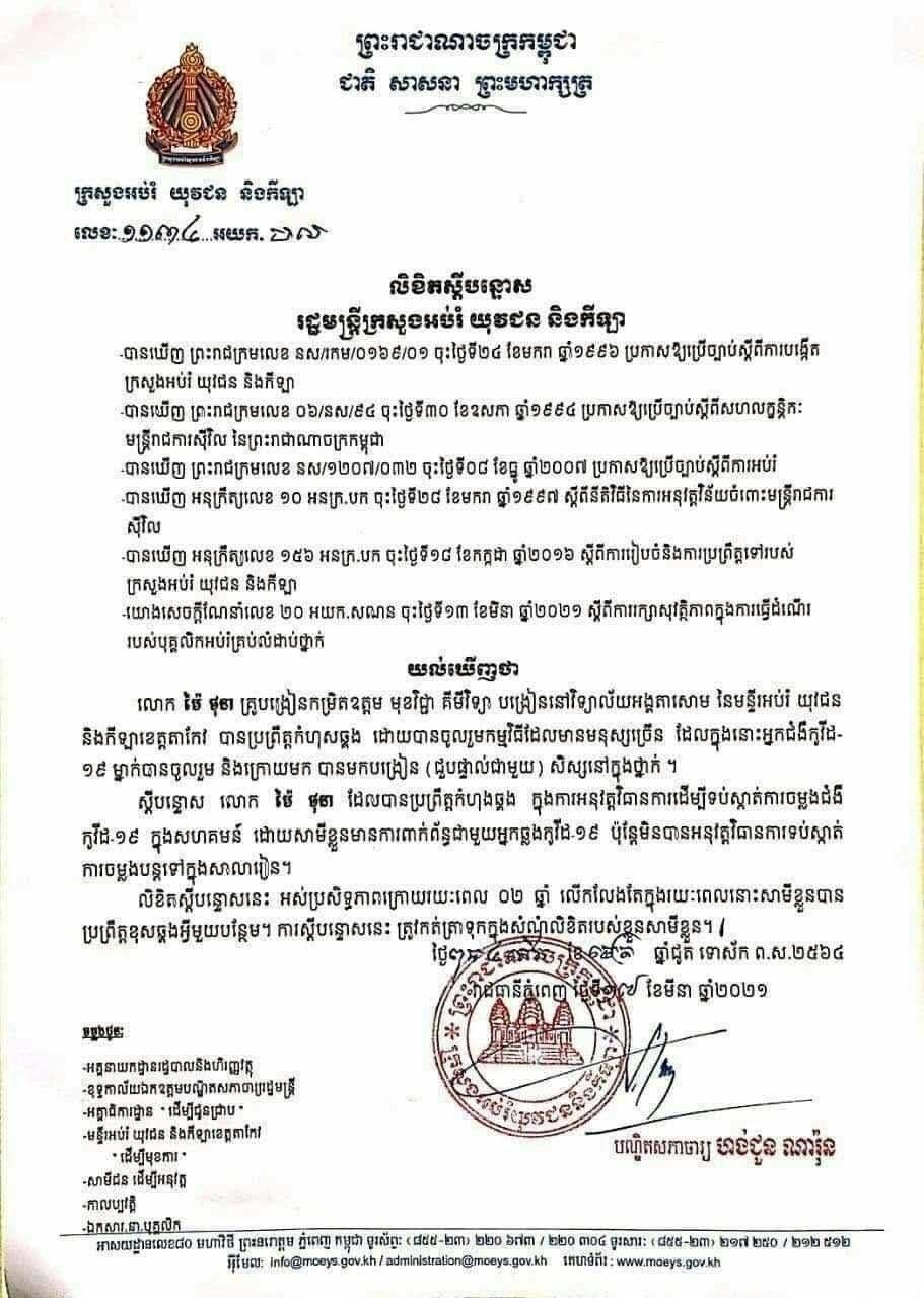 ក្រសួងអប់រំ ចេញលិខិតស្តីបន្ទោស គ្រូបង្រៀនម្នាក់នៅវិទ្យាល័យអង្គតាសោម ដោយចូលរួមកម្មវិធីមានមនុស្សច្រើន ហើយមានអ្នកវិជ្ជមានកូវីដ១៩ ប៉ុន្តែនៅតែមកបង្រៀនសិស្សផ្ទាល់ក្នុងថ្នាក់