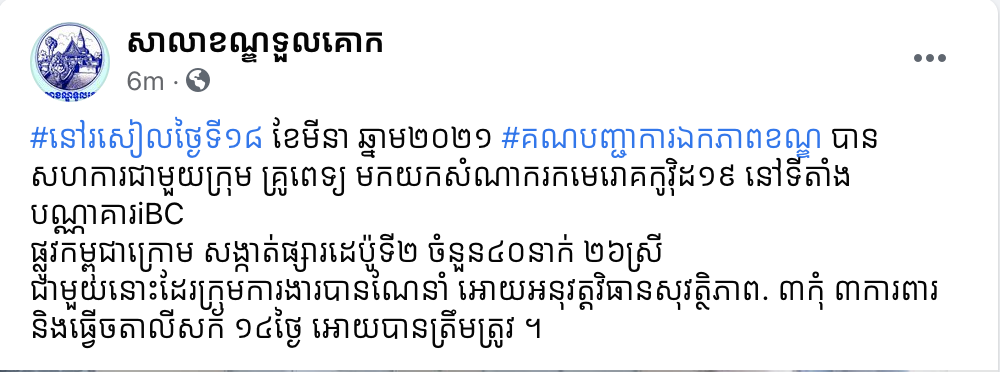 យោងតាមការបញ្ជាក់ពី សាលាខណ្ឌទួលគោក បានឲ្យដឹងថា នៅរសៀលថ្ងៃទី១៨ ខែមីនា ឆ្នាំ២០២១ គណបញ្ជាការឯកភាពខណ្ឌ បានសហការជាមួយក្រុម គ្រូពេទ្យ មកយកសំណាករកមេរោគកូវីដ១៩ នៅទីតាំង បណ្ណាគារ IBC ផ្លូវកម្ពុជាក្រោម សង្កាត់ផ្សារដេប៉ូទី២ ចំនួន៤០នាក់ ២៦ស្រី ជាមួយនោះដែរក្រុមការងារបានណែនាំ អោយអនុវត្តវិធានសុវត្ថិភាព. ៣កុំ ៣ការពារ និងធ្វើចតាលីសក័ ១៤ថ្ងៃ អោយបានត្រឹមត្រូវ៕