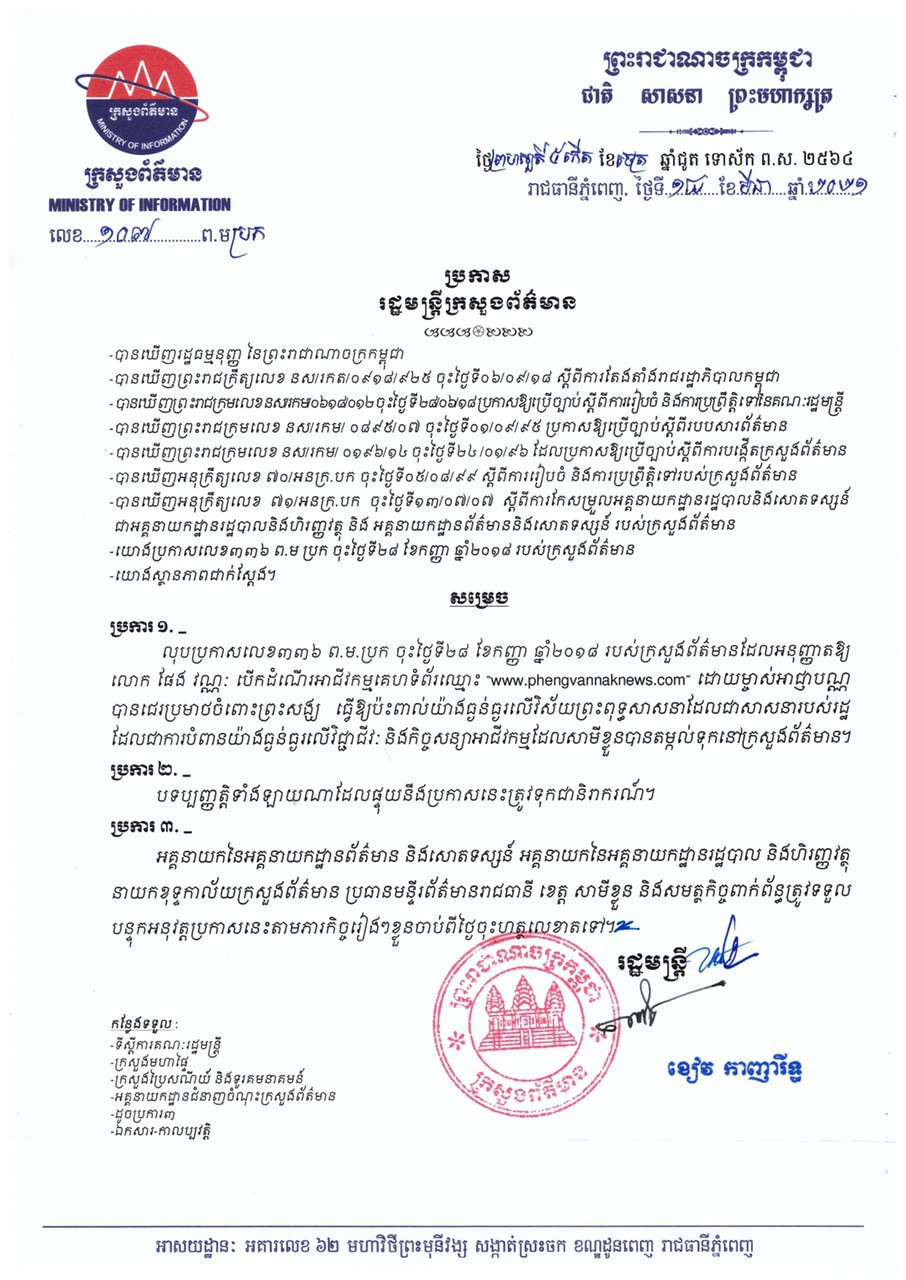 មុននេះបន្តិចក្រសួងព័ត៌មានបានចេញសេចក្តីប្រកាសសម្រេចលុបចោលអាជ្ញាបណ្ណរបស់លោកផែង វណ្ណៈ ដែលមានគេហទំព័រឈ្មោះ www.phengvannaknews.com នេះបើតាមមន្រ្តីជាន់ខ្ពស់ក្រសួងព័ត៌មានបានផ្ញើមកកាន់អង្គភាពខ្មែរណូតមុននេះ។ នៅក្នុងប្រកាសរបស់ក្រសួងបានបញ្ជាក់ថាមូលហេតុនៃការលុបនេះ ដោយសារម្ចាស់អាជ្ញាបណ្ណបានជេរប្រមាថចំពោះព្រះសង្ឃ ធ្វើឲ្យប៉ះពាល់យ៉ាងធ្ងន់ធ្ងរលើវិស័យព្រះពុទ្ធសាសនាដែលជាសាសនារបស់រដ្ឋ។