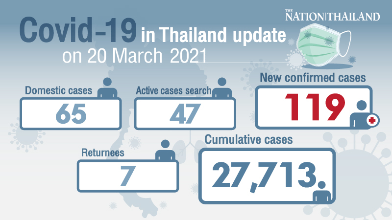 យោងតាមការចុះផ្សាយរបស់សារព័ត៌មាន The Nation Thailand នៅថ្ងៃសៅរ៍ ទី២០ ខែមីនា ឆ្នាំ២០២១ បានរាយការណ៍ថា ប្រទេសថៃបានរកឃើញករណីថ្មីនៃជំងឺ COVID-19 ចំនួន ១១៩ករណី នៅក្នុងរយៈពេល ២៤ ម៉ោងចុងក្រោយនេះ ដោយក្នុងនោះមាន ៧ករណី ជាការនាំចូលពីប្រទេស។ នៅថ្ងៃនេះក៏មានការស្លាប់ថ្មី ១ ត្រូវបានគេបញ្ជាក់ផងដែរ ដែលនាំឱ្យចំនួនស្លាប់សរុបកើនដល់ ៩០នាក់ ចាប់តាំងពីប្រទេសនេះមានវត្តមានជំងឺ COVID-19 ជាលើកដំបូងកាលពីឆ្នាំមុន។