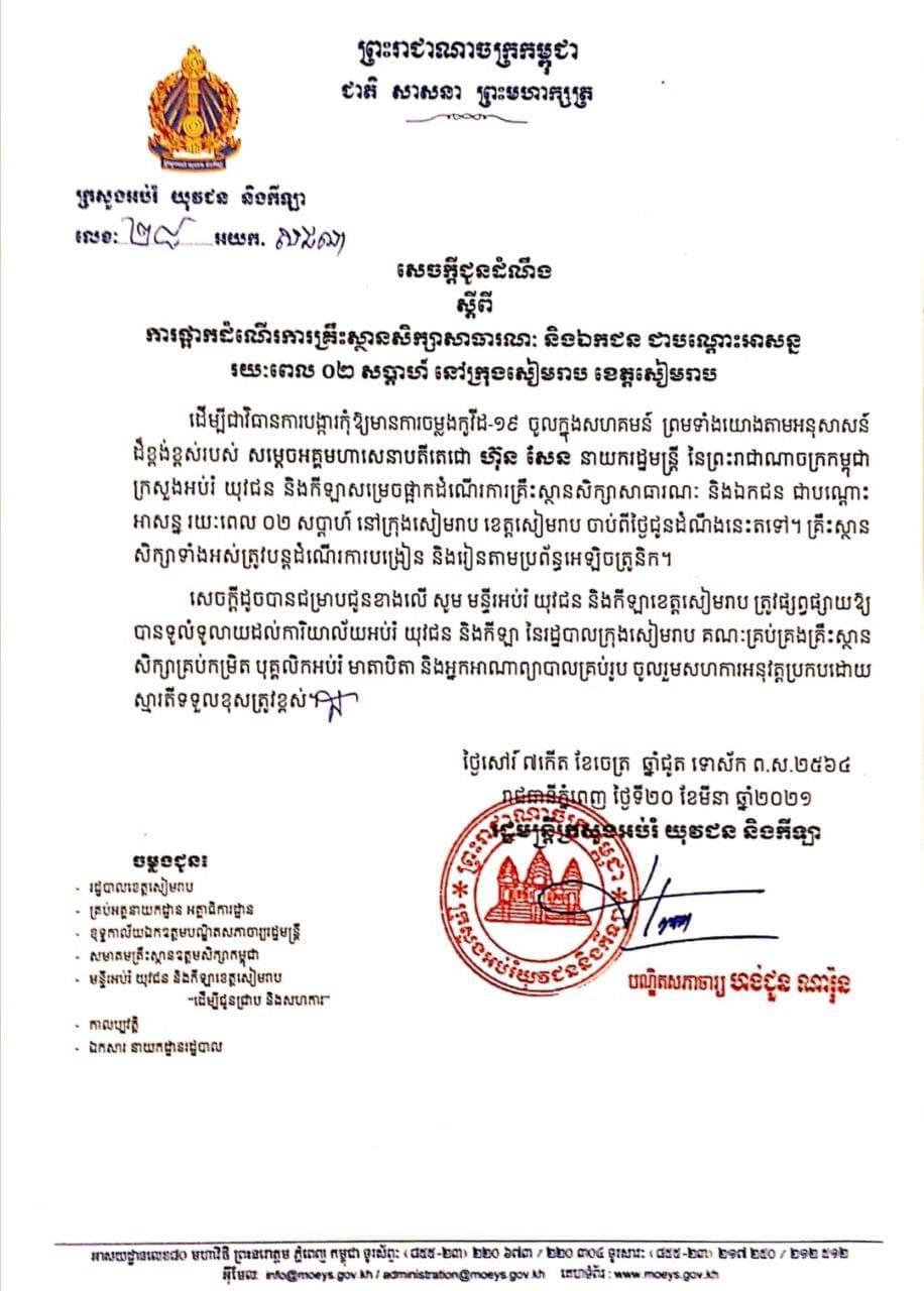 ក្រសួងអប់រំ ប្រកាសផ្អាកសាលាទាំងអស់ក្នុងក្រុងសៀមរាប រយៈពេល ២ សប្តាហ៍ ក្រោយរកឃើញអ្នកកើតជំងឺកូវីដ១៩ម្នាក់