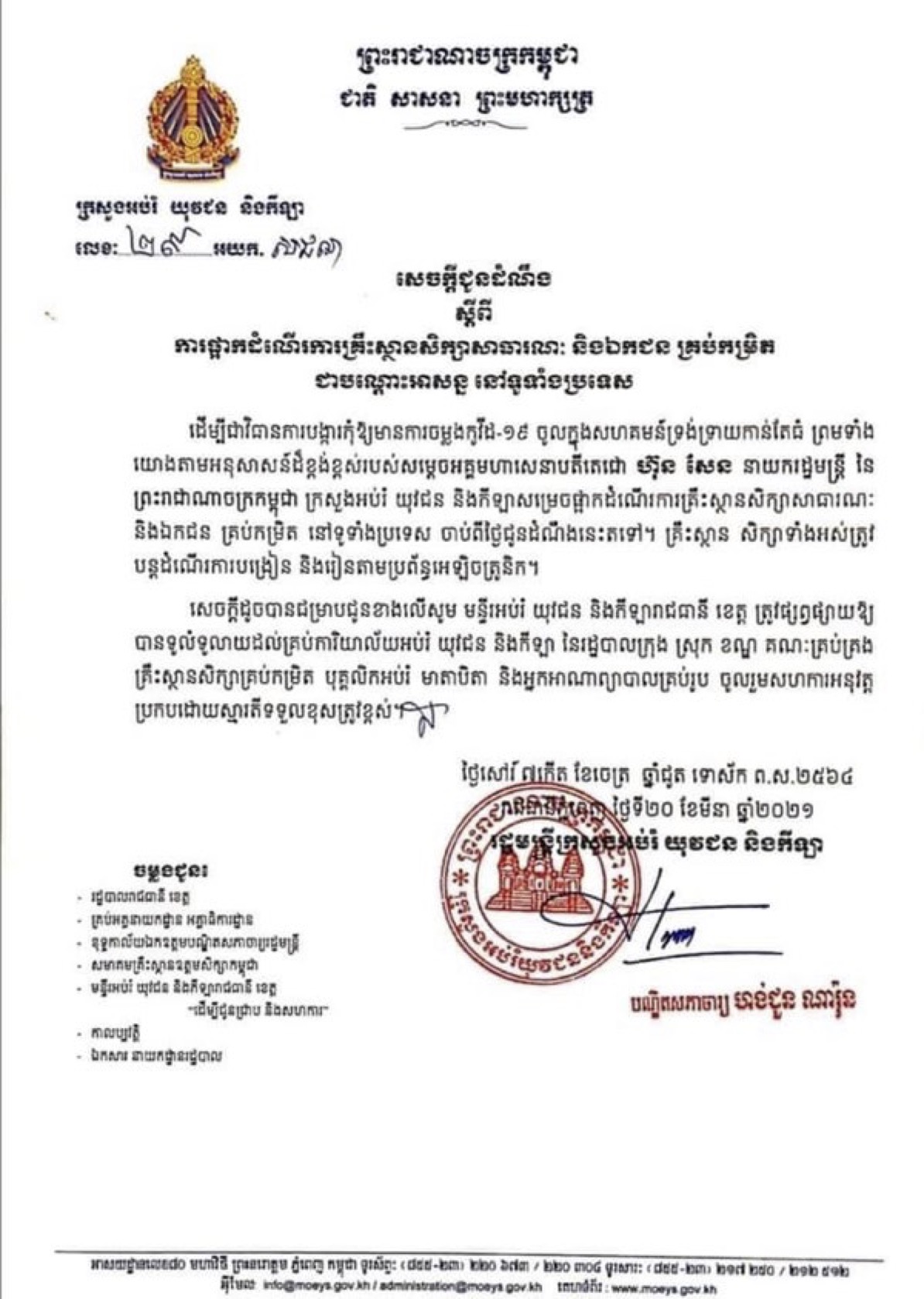 ដើម្បីជាវិធានការបង្ការកុំឲ្យមានការចម្លងកូវីដ១៩ ចូលក្នុងសហគមន៍ទ្រង់ទ្រាយកាន់តែធំ ព្រមទាំងយោងតាមអនុសាសន៍ដ៏ខ្ពង់ខ្ពស់របស់សម្តេចអគ្គមហាសេនាបតីតេជោ ហ៊ុន សែនន នាយករដ្ឋមន្ត្រី នៃព្រះរាជាណាចក្រកម្ពុជា ក្រសួងអប់រំ យុវជន និងកីឡាសម្រេចផ្អាកដំណើរការគ្រឹះស្ថានសិក្សាសាធារណៈ និងឯកជន គ្រប់កម្រិត នៅទូទាំងប្រទេស ចាប់ពីថ្ងៃជូនដំណឹងនេះតទៅ។ គ្រឹះស្ថាន សិក្សាទាំងអស់ត្រូវបន្តដំណើរការបង្រៀន និងរៀនតាមប្រព័ន្ធអេឡិចត្រូនិក។