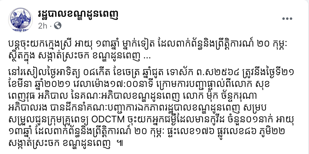 យោងតាមការបញ្ជាក់នៅលើគណនីហ្វេសប៊ុក រដ្ឋបាលខណ្ឌដូនពេញ បានឲ្យដឹងថា នៅរសៀលថ្ងៃអាទិត្យ ០៨កើត ខែចេត្រ ឆ្នាំជូត ទោស័ក ព.ស២៥៦៤ ត្រូវនឹងថ្ងៃទី២១ ខែមីនា ឆ្នាំ២០២១ វេលាម៉ោង១៧:០០នាទី ក្រោមការបញ្ជាផ្ទាល់ពីលោក សុខ ពេញវុធ អភិបាល នៃគណៈអភិបាលខណ្ឌដូនពេញ លោក ម៉ុក ច័ន្ទករុណា អភិបាលរង បានដឹកនាំគណៈបញ្ជាការឯកភាពរដ្ឋបាលខណ្ឌដូនពេញ សម្របសម្រួលជូនក្រុមគ្រូពេទ្យ ODCTM ចុះយកអ្នកជំងឺដែលមានកូវីដ ចំនួន០១នាក់ អាយុ ១៣ឆ្នាំ ដែលពាក់ព័ន្ធនិងព្រឹត្តិការណ៍ ២០ កុម្ភៈ ផ្ទះលេខ១៧៦ ផ្លូវលេខ៨៦ ភូមិ២២ សង្កាត់ស្រះចក ខណ្ឌដូនពេញ ៕