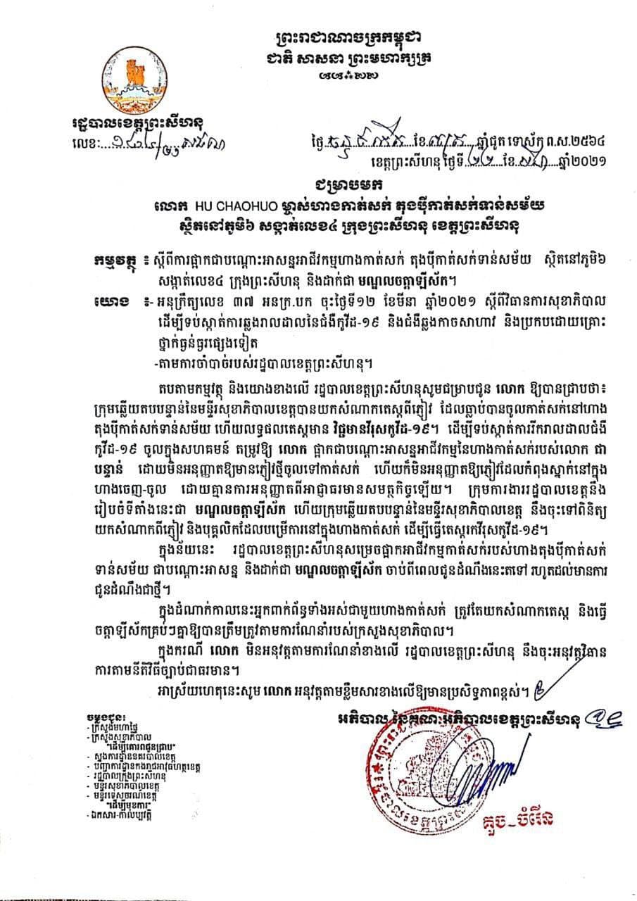 យោងតាមលិខិតរបស់រដ្ឋបាលខេត្តព្រះសីហនុ ស្តីពីការផ្អាកហាងកាត់សក់ឈ្មោះ​ តុងប៉ីកាត់សក់ទាន់សម័យ បណ្តោះអាសន្ន ដែលស្ថិតនៅភូមិ៦ សង្កាត់លេខ៤ ក្រុងព្រះសីហនុ និងដាក់ជាមណ្ឌលចត្តាឡីស័ក ក្រោយរកឃើញមានភ្ញៀវម្នាក់ធ្លាប់បានចូលហាងកាត់សក់មួយនេះ រកឃើញមានវិជ្ជមានកូវីដ-១៩។