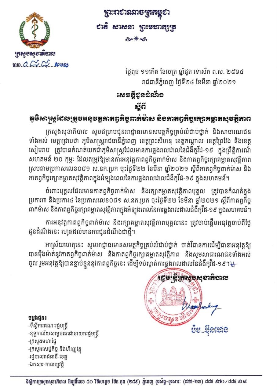 រាជធានីភ្នំពេញ៖ យោងតាមលិខិតសាររបស់ ក្រសួងសុខាភិបាល នាថ្ងៃទី២៤ ខែមីនា​ ឆ្នាំ២០២១នេះ បានចេញសេចក្តីជូនដំណឹង ស្តីពីភូមិសាស្ត្រ ដែលត្រូវអនុវត្តកាតព្វកិច្ចពាក់ម៉ាស និងកាតព្វកិច្ចរក្សាគម្លាតសុចត្ថិភាព។ ក្នុងសេចក្តីជូនដំណឹងខាងលើ បានបញ្ជាក់ថា ក្រសួងសុខាភិបាលបានប្រកាស យកភូមិសាស្ត្ររាជធានីភ្នំពេញ, កណ្តាល,ព្រៃវែង សៀមរាប និងព្រះសីហនុ ត្រូវបានកំណត់ជាតំបន់ដែលមានឆ្លងរីករាលដាលជំងឺកូវីដ-១៩ ក្នុងព្រឹត្តិការណ៍សហគមន៍២០កុម្ភៈ ដែលតម្រូវឱ្យពាក់ម៉ាស និងរក្សាគម្លាតជាចាំបាច់។