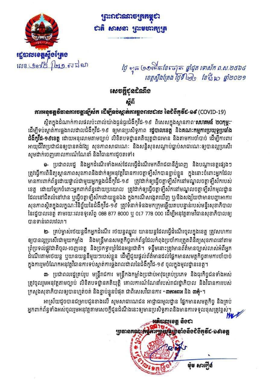 ខេត្តស្ទឹងត្រែង៖ យោងតាមសារលិខិតរបស់ រដ្ឋបាលខេត្តស្ទឹងត្រែង នៅថ្ងៃទី២៤ ខែមីនា ឆ្នាំ២០២១ ចេញសេចក្តីជូនដំណឹងស្តីពី ការអនុវត្តវិធានការចត្តាឡីស័ក ដើម្បីទប់ស្កាត់ការឆ្លងរាលដាល នៃជំងឺកូវីដ-១៩ ឲ្យមានប្រសិទ្ធភាព រដ្ឋបាលខេត្តបានអនុលោមតាមច្បាប់ លិខិតបទដ្ឋានគតិយុត្តជាធរមាន និងតាមការចាំបាច់ ដើម្បីការពារអាយុជីវិតប្រជាជនឲ្យបានគង់វង្ស សុខភាពសាធារណៈ និងសន្តិសុខសណ្ដាប់ធ្នាប់សាធារណៈឲ្យបានល្អប្រសើរ សូមដាក់ចេញគោលការណ៍ណែនាំ និងវិធានការដូចតទៅ៖