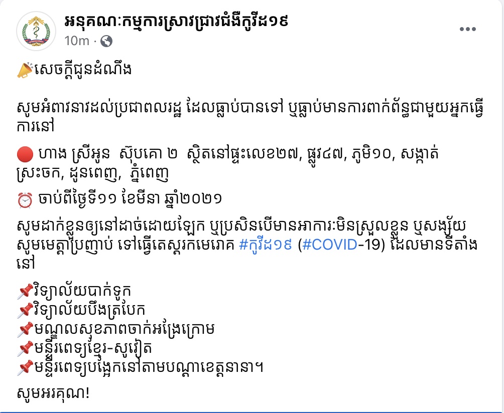 យោងតាមការបញ្ជាក់ពី អនុគណៈកម្មការស្រាវជ្រាវជំងឺកូវីដ១៩ បានចេញសេចក្តីជូនដំណឹងអំពាវនាវដល់ប្រជាពលរដ្ឋ ដែលធ្លាប់បានទៅ ឬធ្លាប់មានការពាក់ព័ន្ធជាមួយអ្នកធ្វើការនៅ​ ហាង ស្រីអូន ស៊ុបគោ ២ ស្ថិតនៅផ្ទះលេខ២៧ ផ្លូវ៤៧ ភូមិ១០ សង្កាត់ស្រះចក ខណ្ឌដូនពេញ រាជធានីភ្នំពេញ ចាប់ពីថ្ងៃទី១១ ខែមីនា ឆ្នាំ២០២១។