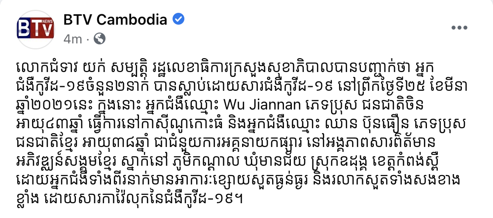 យោងតាមការបង្ហោះឲ្យដឹងនៅលើគណនីហ្វេសប៊ុក BTV Cambodia បានឲ្យដឹងថា លោកជំទាវ យក់ សម្បត្តិ រដ្ឋលេខាធិការក្រសួងសុខាភិបាលបានបញ្ជាក់ថា អ្នកជំងឺកូវីដ-១៩ចំនួន២នាក់ បានស្លាប់ដោយសារជំងឺកូវីដ-១៩ នៅព្រឹកថ្ងៃទី២៥ ខែមីនា ឆ្នាំ២០២១នេះ ក្នុងនោះ អ្នកជំងឺឈ្មោះ Wu Jiannan ភេទប្រុស ជនជាតិចិន អាយុ៤៣ឆ្នាំ ធ្វើការនៅកាស៊ីណូកោះធំ និងអ្នកជំងឺឈ្មោះ ឈាន ប៊ុនធឿន ភេទប្រុស ជនជាតិខ្មែរ អាយុ៣៨ឆ្នាំ ជាជំនួយការអគ្គនាយកផ្សារ នៅអង្គភាពសារព៌ត័មានអភិវឌ្ឈន៍សង្គមខ្មែរ ស្នាក់នៅ ភូមិកណ្ដាល ឃុំមានជ័យ ស្រុកឧដុង្គ ខេត្តកំពង់ស្ពឺ ដោយអ្នកជំងឺទាំងពីរនាក់មានអាការៈខ្សោយសួតធ្ងន់ធ្ងរ និងរលាកសួតទាំងសងខាងខ្លាំង ដោយសារកាវ៉ៃលុកនៃជំងឺកូវីដ-១៩។