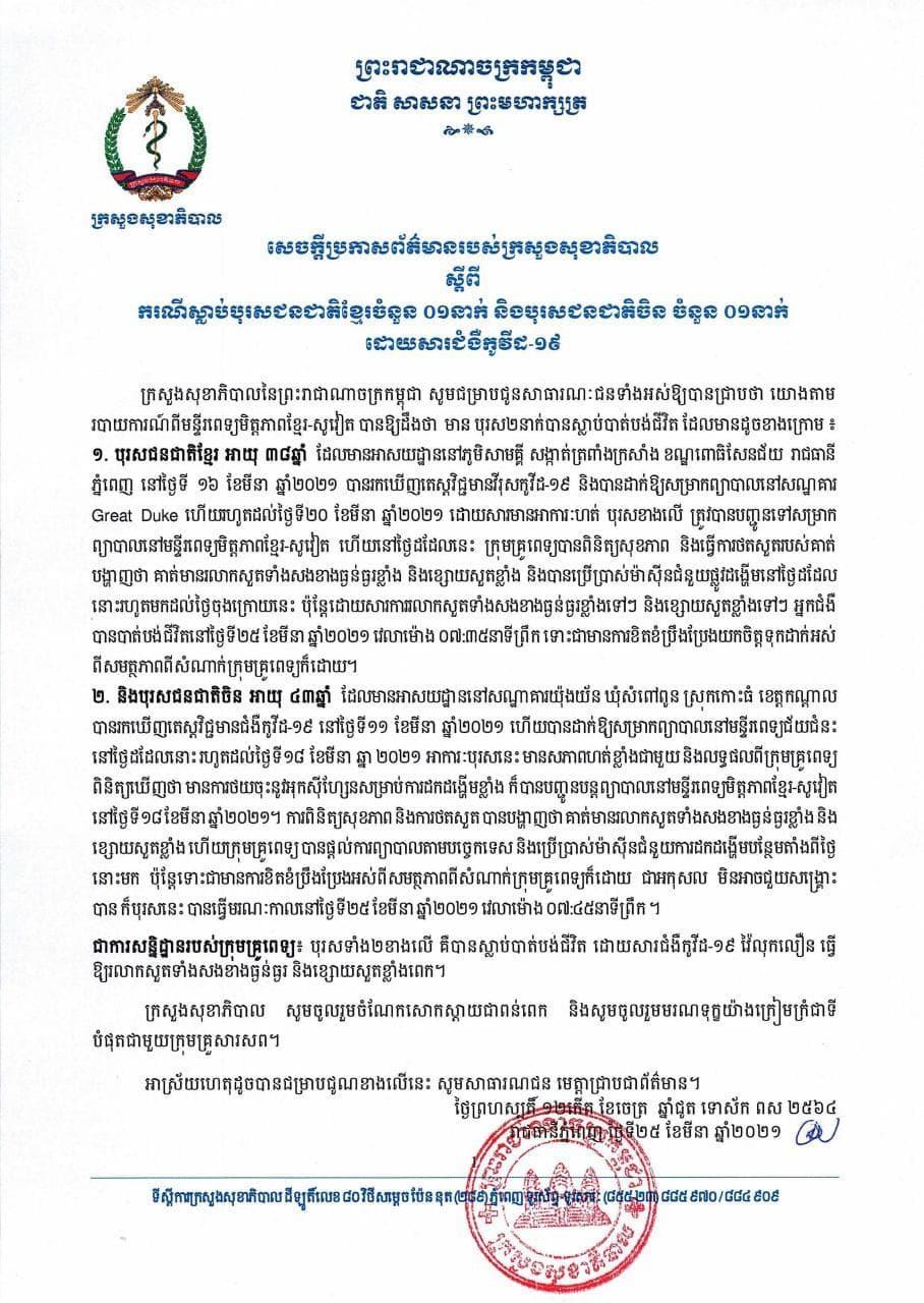 បើតាមសេចក្តីប្រកាសព័ត៌មានរបស់ក្រសួងសុខាភិបាលនៅមុននេះបន្តិចជុំវិញករណីមរណភាពអ្នកជំងឺ២នាក់ ដែលបានត្រូវបានមេរោគកូវីដ-១៩ វាយលុកសួតធ្វើអោយរលាកសួតធ្ងន់ធ្ងររហូតស្លាប់បាត់បង់ជីវិតនៅព្រឹកថ្ងៃទី២៥ ខែមីនា ឆ្នាំ២០២១នេះ។