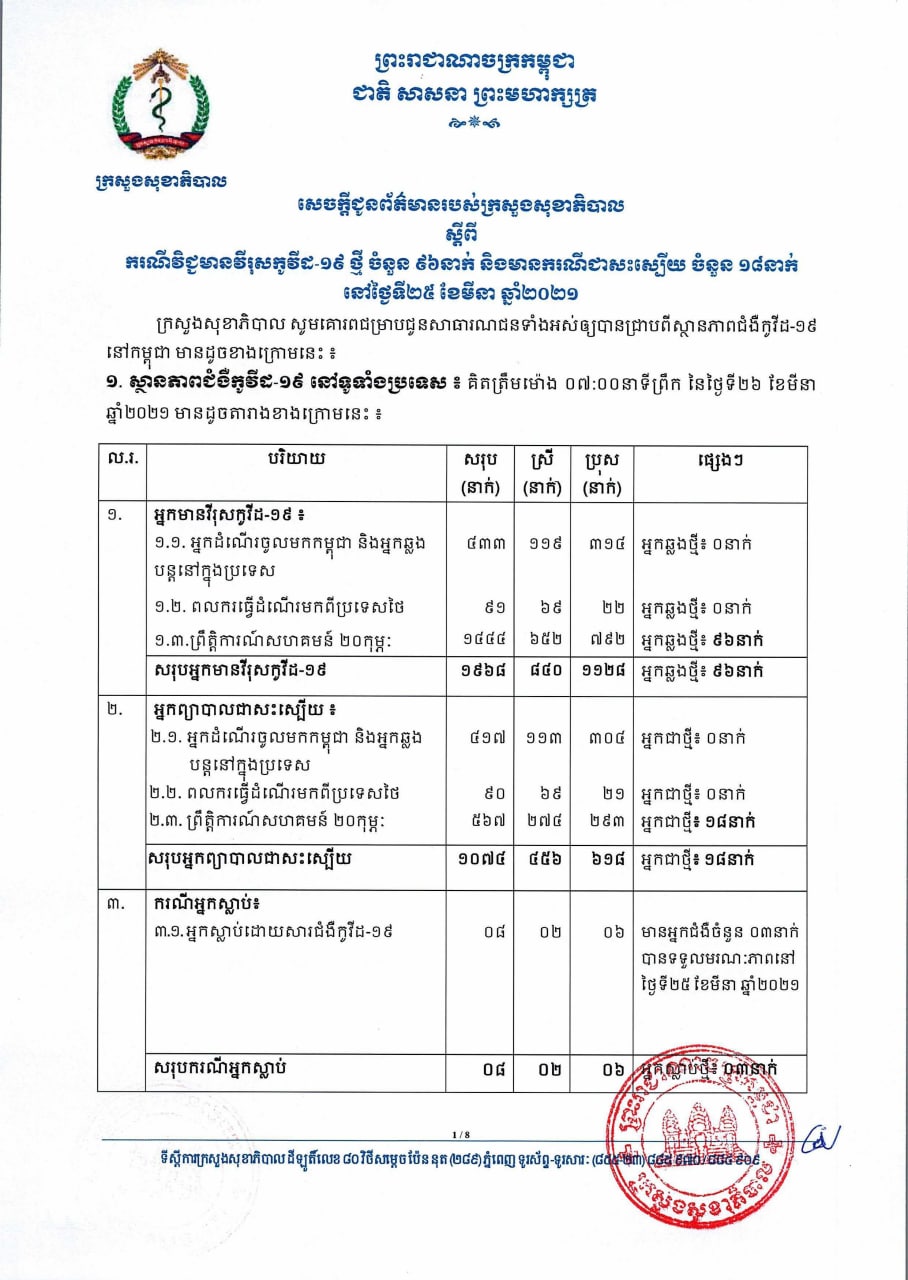 រសៀលថ្ងៃទី២៦ ខែមីនា ឆ្នាំ២០២១នេះ ក្រសួងសុខាភិបាលកម្ពុជា បានចេញសេចក្តីជូនដំណឹងពី ការរកឃើញករណីវិជ្ជមានវីរុសកូវីដ១៩ថ្មី ចំនួន ៩៦នាក់ និងមានករណីជាសះស្បើយថ្មី ១៨នាក់ផងដែរ។