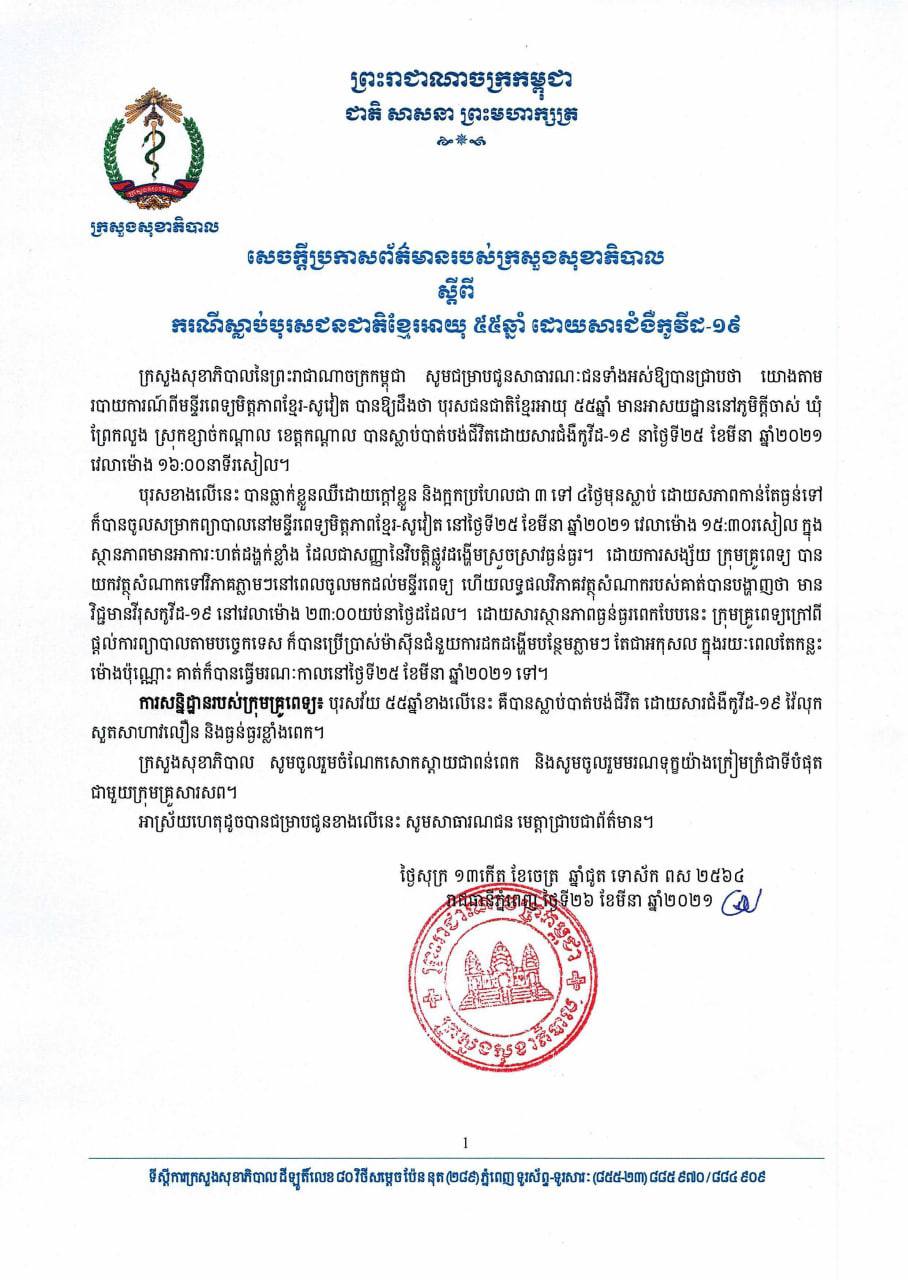 នៅក្នុងសេចក្តីប្រកាសព័ត៌មានបានអោយដឹងថា បុរសរូបនេះបានធ្លាក់ខ្លួនឈឺដោយក្តីខ្លួន និងក្អកប្រហែលជា៣ទៅ៤ថ្ងៃមុនស្លាប់ ដោយសភាពកាន់តែធ្ងន់ធ្ងរក៏បានចូលសម្រាកព្យាបាលនៅមន្ទីរពេទ្យមិត្តភាពខ្មែរ-សូវៀត នៅថ្ងៃទី២៥ ខែមីនា ឆ្នាំ២០២១។ ក្រសួងបានសង្កត់ធ្ងន់ថា ដោយមានការសង្ស័យ ក្រុមគ្រូពេទ្យបានយកសំណាកគាត់ទៅពិនិត្រភ្លាមៗ ហើយរកឃើញថាគាត់មានផ្ទុកវីរុសកូវីដ-១៩ ហើយក្រុមគ្រូពេទ្យក៏បានព្យាបាលគាត់តាមបច្ចេកទេស និងប្រើប្រាស់ម៉ាស៊ីនជំនួយការដកដង្ហើម តែជាអកុសល ក្នុងរយៈពេលតែកន្លះម៉ោងប៉ុណ្ណោះ គាត់បានធ្វើមរណកាលទៅតែម្តង នៅថ្ងៃទី២៥ ខែមីនា ឆ្នាំ២០២១៕