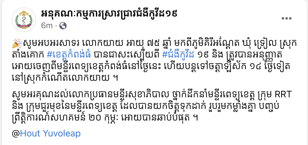 យោងតាមការបញ្ជាក់ពី អនុគណៈកម្មការស្រាវជ្រាវជំងឺកូវីដ១៩ បានឲ្យដឹងថា សូមអបអរសាទរ លោកយាយ អាយុ ៧៥ ឆ្នាំ មកពីភូមិគិរីអណ្តែត ឃុំ ទ្រៀល ស្រុកតាំងគោក ខេត្តកំពង់ធំ បានជាសះស្បើយពី ជំងឺកូវីដ ១៩ និង ត្រូវបានអនុញ្ញាតអោយចេញពីមន្ទីរពេទ្យខេត្តកំពង់ធំនៅថ្ងៃនេះ ហើយបន្តទៅចត្តាឡីស័ក ១៤ ថ្ងៃទៀត នៅស្រុកកំណើតលោកយាយ ។
