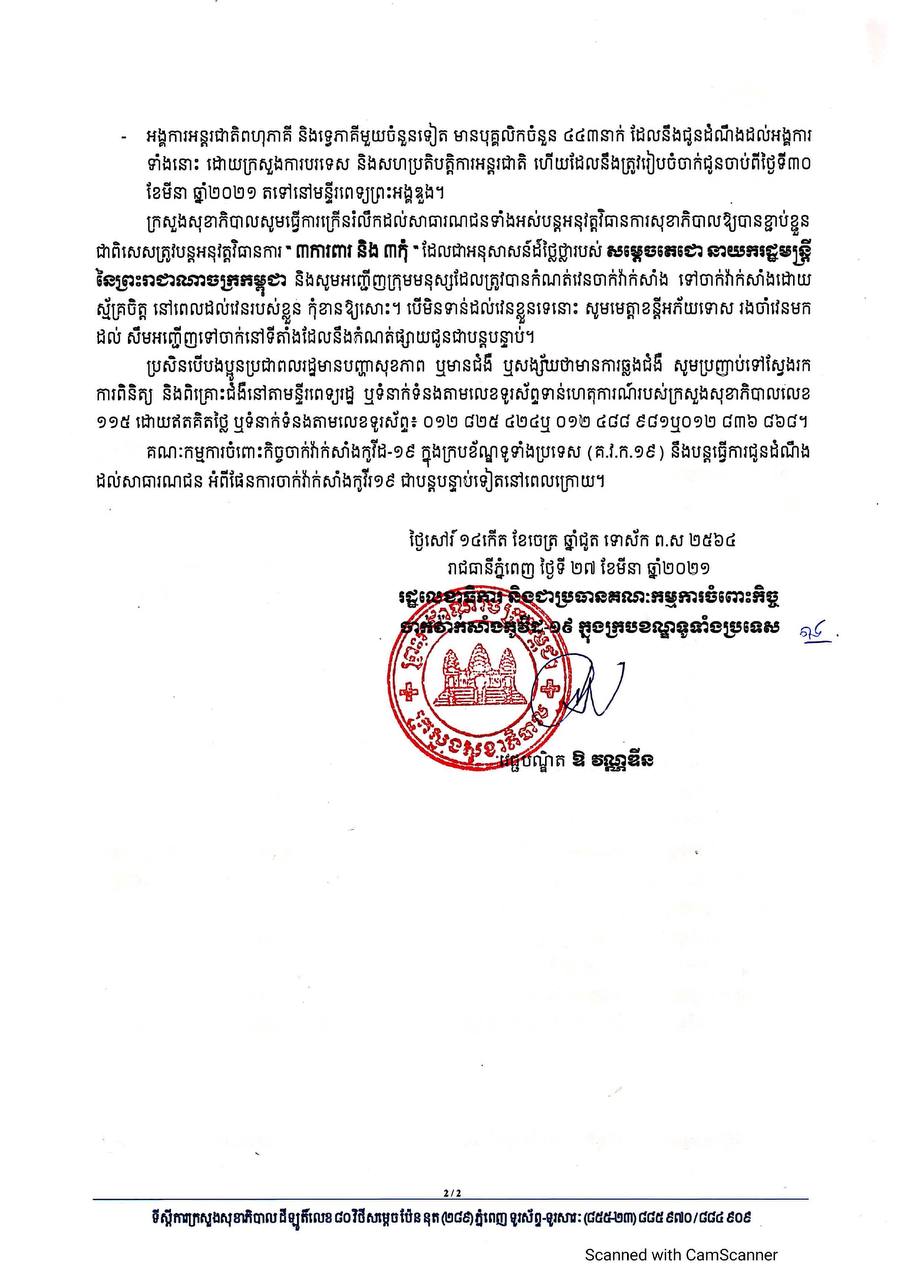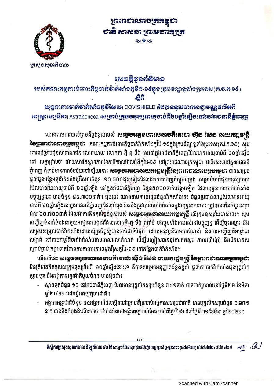 សូមអញ្ជើញទំនាក់ទំនងជាមួយអាជ្ញាធរសង្កាត់ដែលលោកអ៊ុំ ពូ មីង ពុកម៉ែ បងប្អូនទាំងអស់នៅបច្ចុប្បន្ន ដើម្បីចុះឈ្មោះ និងសម្របសម្រួលចាក់វ៉ាក់សាំងដោយស្ម័គ្រចិត្តឲ្យបានឆាប់ជាទីបំផុត ដោយអនុវត្តន៍តាមការណែនាំ និងការអញ្ជើញពីអាជ្ញាធរសង្កាត់ ទៅតាមកម្មវិធីចាក់វ៉ាក់សាំងតាមពេលវេលាកំណត់។ លើសពីនេះ សម្តេចអគ្គមហាសេនាបតីតេជោ ហ៊ុន សែន នាយករដ្ឋមន្រ្តី នៃព្រះរាជាណាចក្រកម្ពុជា មិនត្រឹមគិតគូរដល់ក្រុមមនុស្សវ័យ ៦០ឆ្នាំឡើងនោះទេ គឺបានសម្រេចអនុញ្ញាតដ៏ខ្ពង់ខ្ពស់ ផ្ដល់ការចាក់វ៉ាក់សាំងជូនបុគ្គលិកស្ថានទូត និងអង្គការអន្តជាតិមួយចំនួនមានដូចខាងក្រោម៖