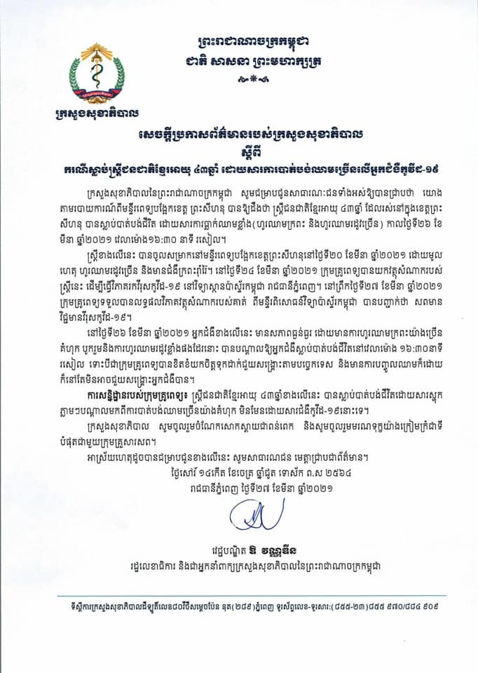 យោងតាមសេចក្តីប្រកាសរបស់ក្រសួងសុខាភិបាលនៅរសៀលថ្ងៃទី២៧ ខែមីនា ឆ្នាំ២០២១នេះស្តីពីករណីមរណភាពលើស្ត្រីម្នាក់នៅខេត្តព្រះសីហនុ គឺស្លាប់ដោយសារធ្លាក់ឈាមខ្លាំង (ហូរឈាមក្រពះ និងហូរឈាមរដូវច្រើន) ខណៈដែលសពត្រូវបានរកឃើញថាមានវិជ្ជមានកូវីដ-១៩។
