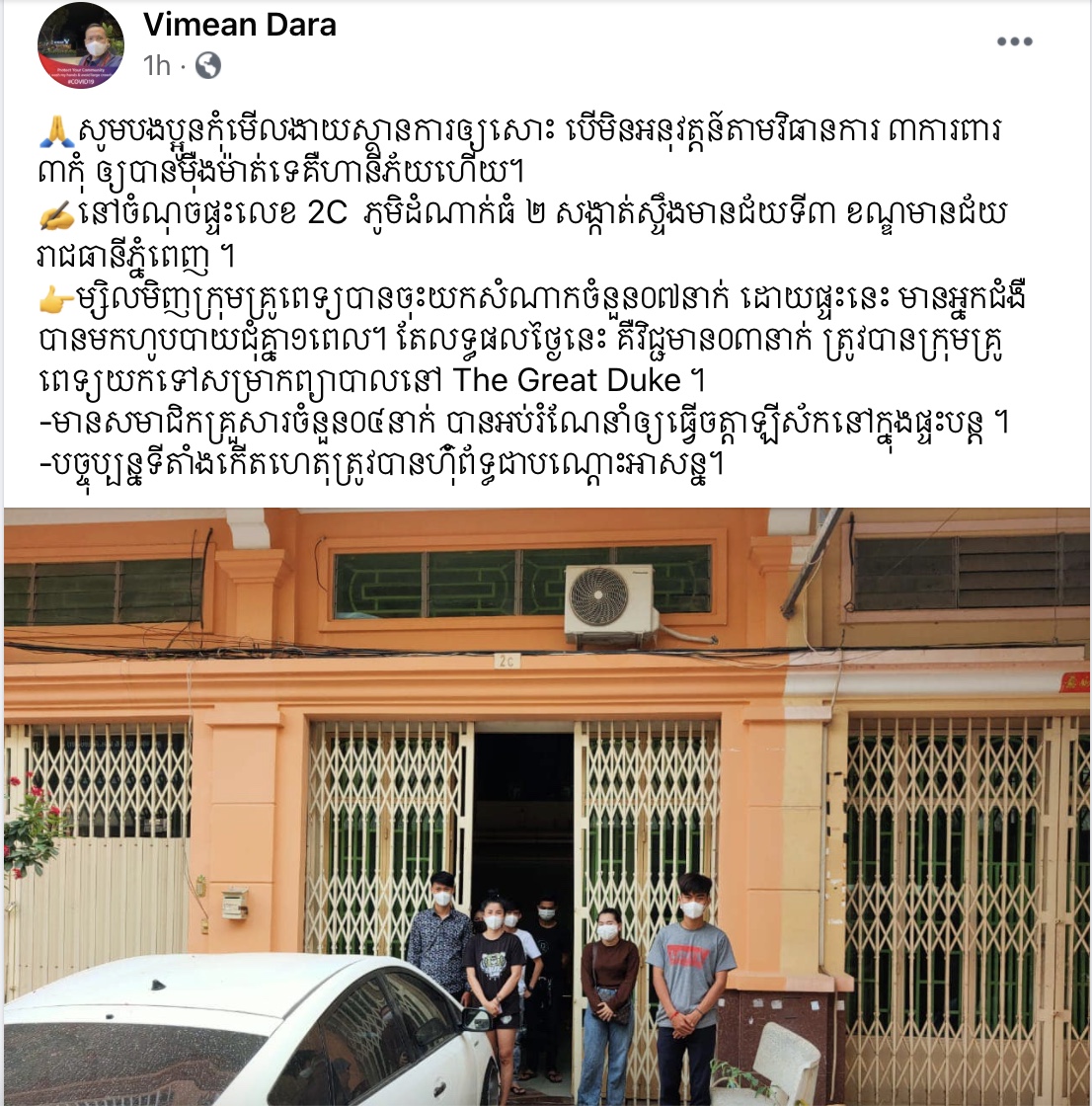 លោកអធិការរូបនេះបានរៀបរាប់ថា៖ “សូមបងប្អូនកុំមើលងាយស្ថានការឲ្យសោះ បើមិនអនុវត្តន៍តាមវិធានការ ៣ការពារ ៣កុំ ឲ្យបានម៉ឺងម៉ាត់ទេគឺហានីភ័យហើយ។ នៅចំណុចផ្ទះលេខ 2C ភូមិដំណាក់ធំ ២ សង្កាត់ស្ទឹងមានជ័យទី៣ ខណ្ឌមានជ័យ រាជធានីភ្នំពេញ ។ ម្សិលមិញក្រុមគ្រូពេទ្យបានចុះយកសំណាកចំនួន០៧នាក់ ដោយផ្ទះនេះ មានអ្នកជំងឺបានមកហូបបាយជុំគ្នា១ពេល។ តែលទ្ធផលថ្ងៃនេះ គឺវិជ្ជមាន០៣នាក់ ត្រូវបានក្រុមគ្រូពេទ្យយកទៅសម្រាកព្យាបាលនៅ The Great Duke ។