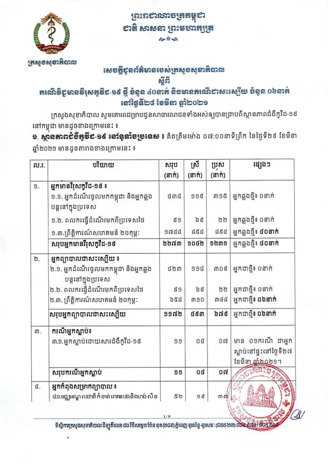 នៅព្រឹកថ្ងៃទី២៩ ខែមីនា ឆ្នាំ២០២១នេះ ក្រសួងសុខាភិបាលកម្ពុជា បានចេញសេចក្តីជូនដំណឹងពី ការរកឃើញករណីវិជ្ជមានវីរុសកូវីដ១៩ថ្មី ចំនួន ៤០នាក់ និងមានករណីជាសះស្បើយថ្មី ០៦នាក់ផងដែរ។