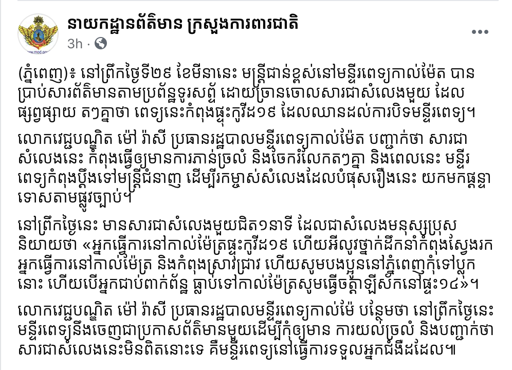 រាជធានីភ្នំពេញ៖ យោងតាមការបញ្ជាក់ពី នាយកដ្ឋានព័ត៌មាន ក្រសួងការពារជាតិ បានឲ្យដឹងថា នៅព្រឹកថ្ងៃទី២៩ ខែមីនានេះ មន្រ្តីជាន់ខ្ពស់នៅមន្ទីរពេទ្យកាល់ម៉ែត បានប្រាប់សារព័ត៌មានតាមប្រព័ន្ឋទូរសព្ទ័ ដោយច្រានចោលសារជាសំលេងមួយ ដែលផ្សព្វផ្សាយ តៗគ្នាថា ពេទ្យនេះកំពុងផ្ទុះកូវីដ១៩ ដែលឈានដល់ការបិទមន្ទីរពេទ្យ។