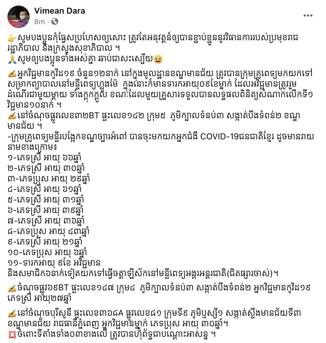 – ក្រុមគ្រូពេទ្យមន្ទីរពេទ្យបង្អែក​​ខណ្ឌច្បារអំពៅ បានចុះមកយកអ្នកជំងឺ COVID-19 ជនជាតិខ្មែរ ដូចមានរាយនាមខាងក្រោម៖