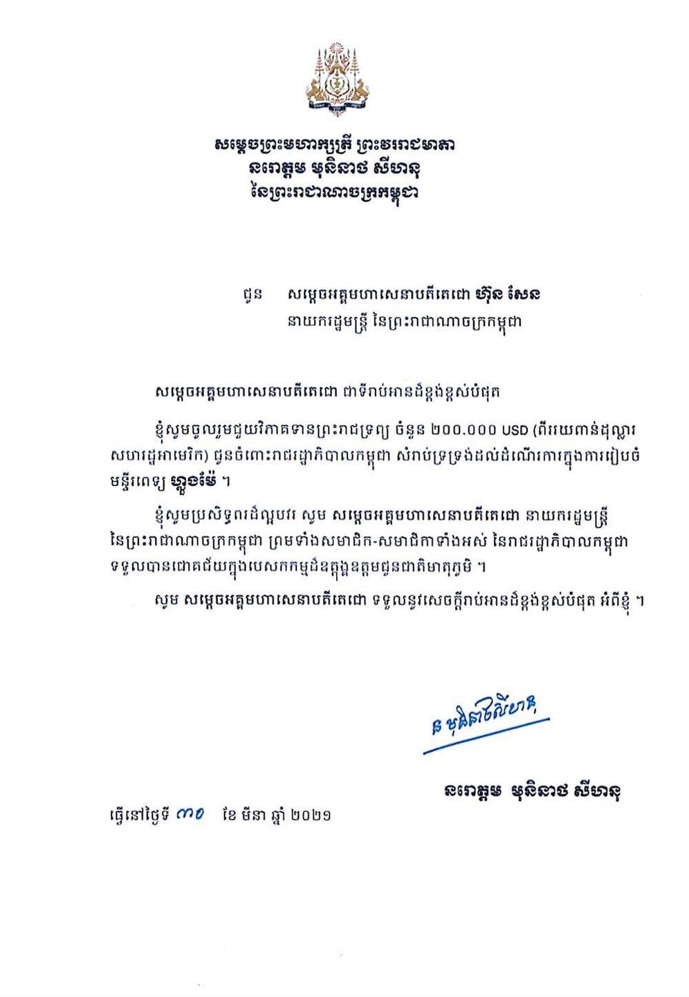 យោងតាមការបញ្ជាក់នៅលើគណនីហ្វេសប៊ុក Royal du Cambodge បានឲ្យដឹងថា សម្តេចព្រះមហាក្សត្រី នរោត្តម មុនិនាថ សីហនុ ព្រះវររាជមាតាជាតិខ្មែរ ក្នុងសេរីភាព សេចក្តីថ្លៃថ្នូរ និងសុភមង្គល ជាទីគោរពសក្ការៈដ៏ខ្ពង់ខ្ពស់បំផុត ស្តេចសព្វព្រះរាជហឫទ័យប្រោសព្រះរាជទានវិភាគទានជាព្រះរាជទ្រព្យផ្ទាល់ដ៏ឧត្តុង្គឧត្តម ចំនួន ២០មុឺនដុល្លារសហរដ្ឋអាមេរិក ជូនដល់រាជរដ្ឋាភិបាលកម្ពុជា ដើម្បីទ្រទ្រង់ដល់ដំណើរការទិញយកមន្ទីរពេទ្យស្រ្តីនគរទេព ដែលបច្ចុប្បន្នជាកន្លែងសម្រាប់ពិនិត្យព្យាបាលអ្នកជំងឺកូវីត១៩ ហើយនឹងត្រូវប្រែក្លាយទៅជាមន្ទីរពេទ្យរដ្ឋ ដោយប្រសិទ្ធនាមថា «មន្ទីរពេទ្យហ្លួងម៉ែ» នាពេលខាងមុខនេះ។