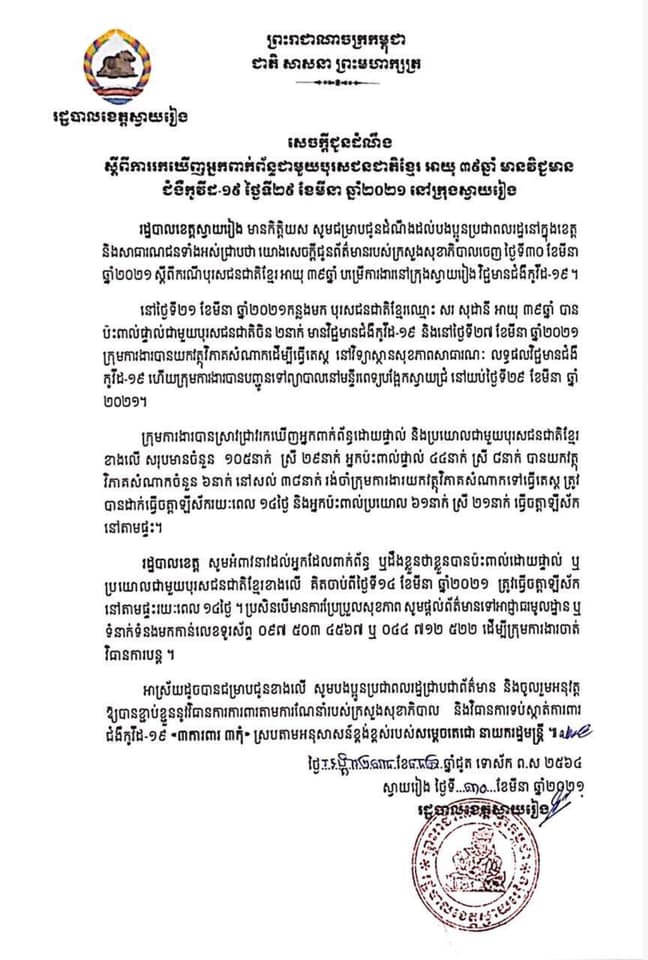 រដ្ឋបាលខេត្តស្វាយរៀង សូមអំពាវនាវដល់អ្នកដែលពាក់ព័ន្ធ ឬដឹងខ្លួនថា ខ្លួនបានប៉ះពាល់ដោយផ្ទាល់ ឬប្រយោលជាមួយបុរសជនជាតិខ្មែរខាងលើ គិតចាប់ពីថ្ងៃទី១៤ ខែមីនា ឆ្នាំ២០២១ ត្រូវធ្វើចត្តាឡីស័កនៅតាមផ្ទះរយៈពេល១៤ថ្ងៃ។ ប្រសិនបើមានការប្រែប្រួលសុខភាព សូមផ្តល់ព័ត៌មានទៅអាជ្ញាធរមូលដ្ឋាន ឬទំនាក់ទំនងមកកាន់លេខទូរស័ព្ទ ០៩៧ ៥០៣ ៤៥៦៧ ឬ ០៤៤ ៧១២ ៥២២ ដើម្បីក្រុមការងារចាត់វិធានការបន្ត៕