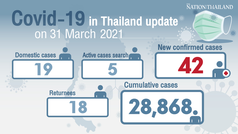 យោងតាមការចុះផ្សាយរបស់សារព័ត៌មាន The Nation Thailand បានឱ្យដឹងថា មជ្ឈមណ្ឌលរដ្ឋបាលសម្រាប់ស្ថានភាពជំងឺ COVID-19 របស់ប្រទេសថៃ បានរាយការណ៍ពីករណីថ្មីនៃជំងឺ COVID-19 ចំនួន ៤២ករណី សម្រាប់ថ្ងៃពុធ ទី៣១ ខែមីនា ឆ្នាំ២០២១។ តួលេខថ្មីៗនេះនាំឱ្យចំនួនសរុបនៃអ្នកឆ្លងជំងឺ COVID-19 នៅប្រទេសថៃ ចាប់តាំងពីជំងឺនេះមានវត្តមានដំបូងកាលពីឆ្នាំមុនកើនដល់ ២៨,៨៦៨ ករណី ខណៈការស្លាប់គឺនៅតែមាន ៩៤ នាក់ដដែល។