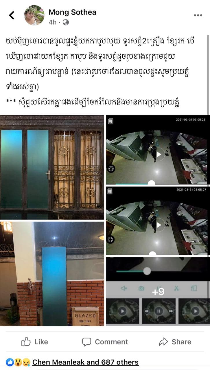 បើតាមសម្ដីបងស្រីម្ចាស់ផ្ទះឈ្មោះ ម៉ុង សុធា ដែលគេស្គាល់ថា ជាកូនស្រីបង្កើតរបស់លោកឧកញ៉ាបណ្ឌិត ម៉ុង ឬទ្ធី បានបង្ហោះរៀបរាប់លើហ្វេសប៊ុកផ្ទាល់ខ្លួនឈ្មោះ “Mong Sothea” ដែលមានខ្លឹមសារទាំងស្រុងថា “យប់ម៉ិញចោរបានចូលផ្ទះខ្ញុំយកកាបូបលុយ ទូរសព្ទ័2គ្រឿង ខ្សែរក បើឃើញចោរវាយកខ្សែក កាបូប និងទូរសព្ទ័ដូចរូបខាងក្រោមជួយរាយការណ៍ឲ្យជាបន្ទាន់ (នេះជារូបចោរដែលបានចូលផ្ទះសូមប្រយត្ន័ទាំងអស់គ្នា)*** សុំជួយស៊ែរតគ្នាផងដើម្បីចែករំលែកនិងមានការប្រុងប្រយត្ន័ ។
