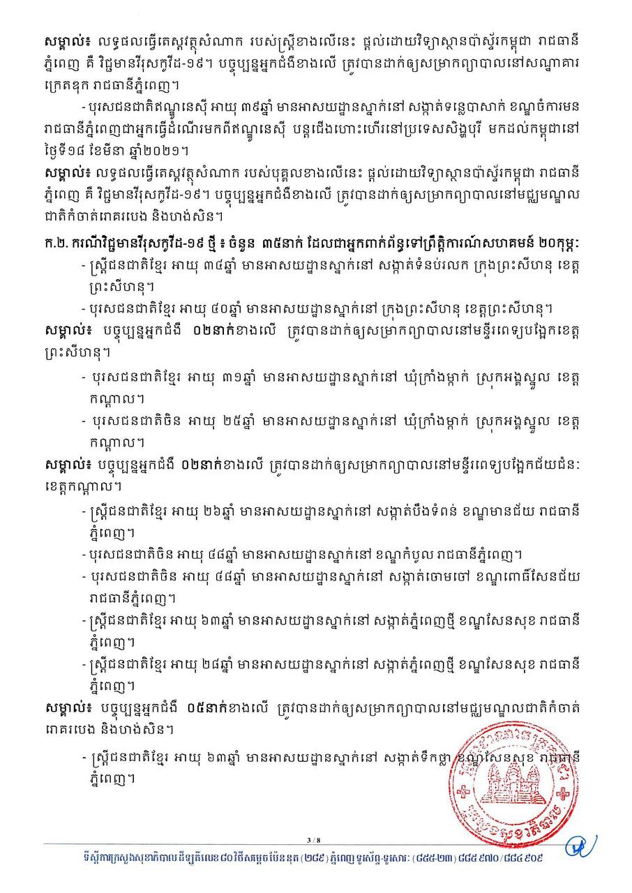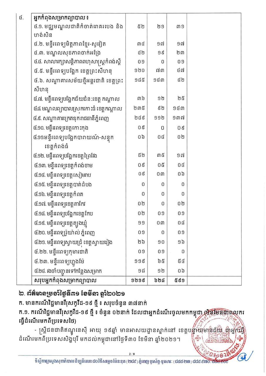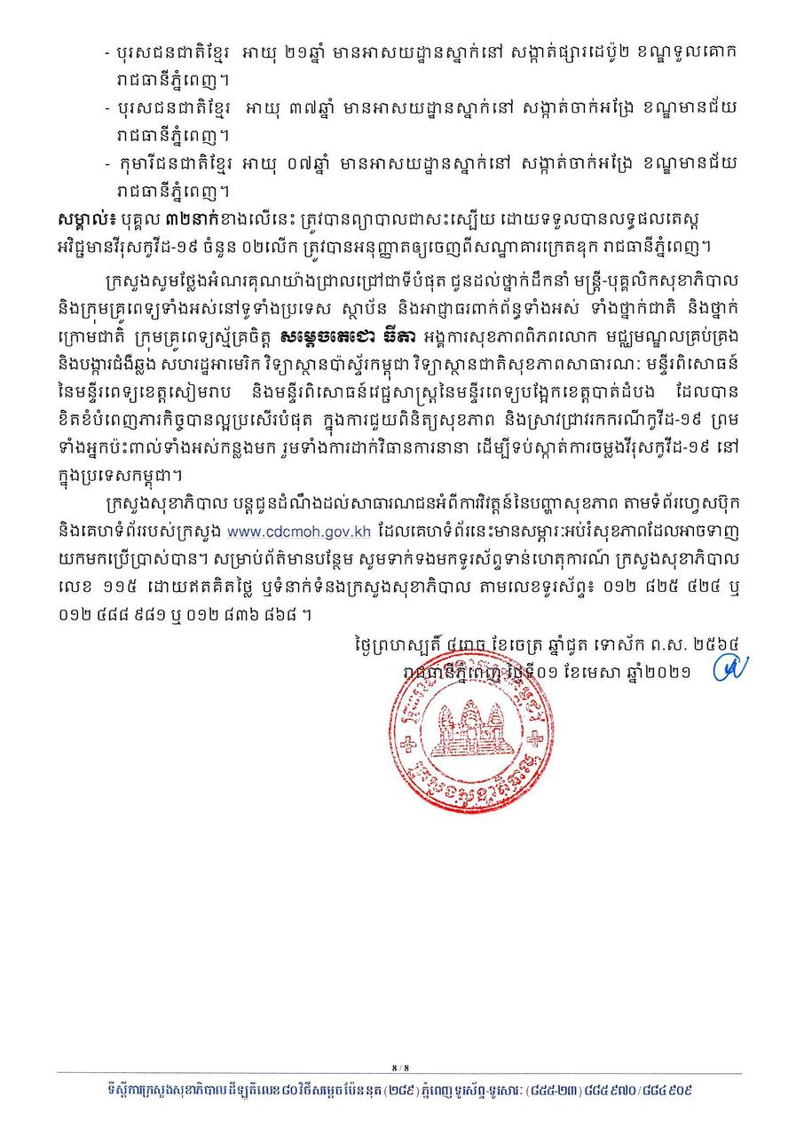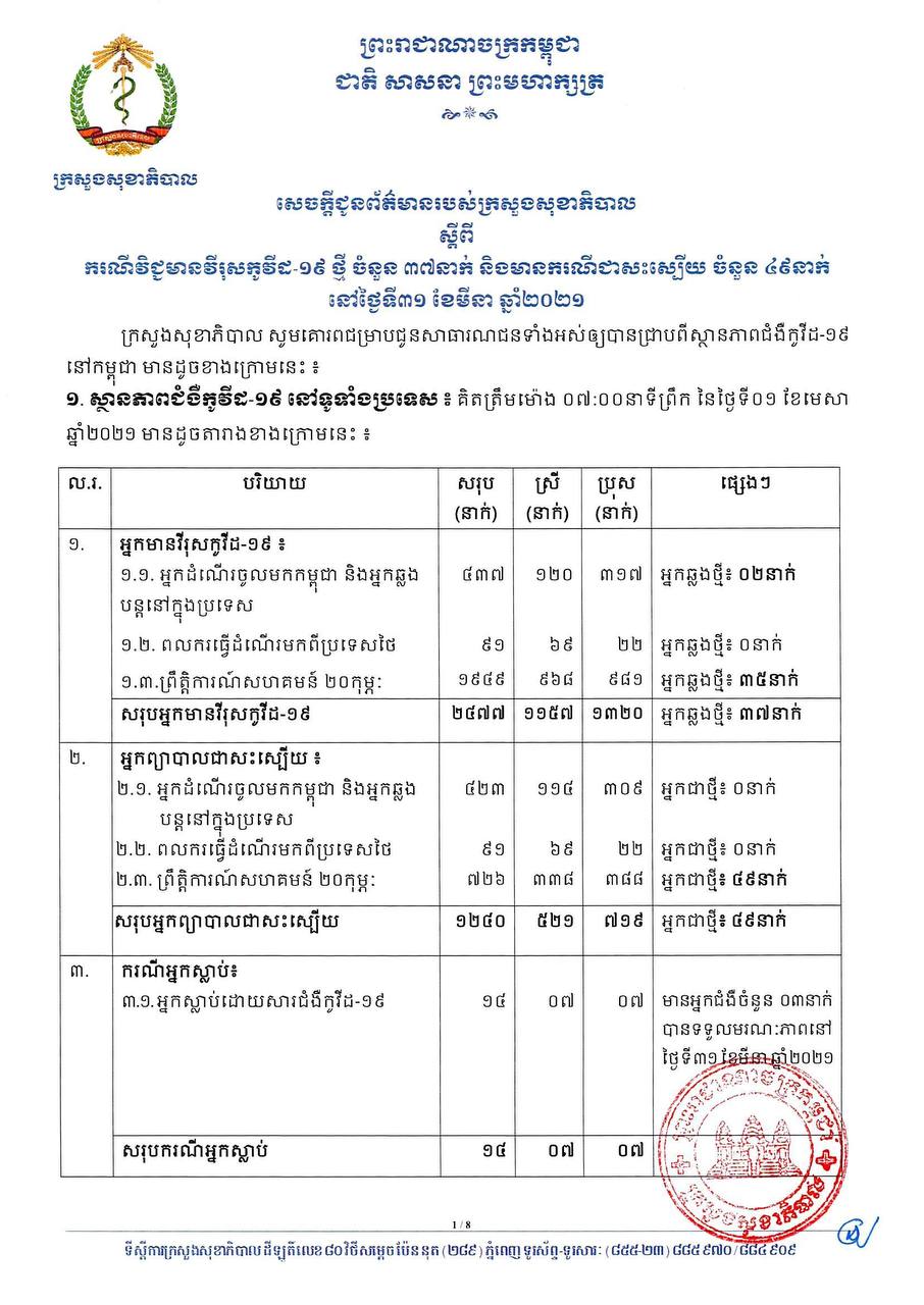 នៅព្រឹកថ្ងៃទី០១ ខែមេសា ឆ្នាំ២០២១នេះ ក្រសួងសុខាភិបាលកម្ពុជា បានចេញសេចក្តីជូនដំណឹងពី ការរកឃើញករណីវិជ្ជមានវីរុសកូវីដ១៩ថ្មី ចំនួន ៣៧នាក់ និងមានករណីជាសះស្បើយថ្មីចំនួន ៤៩នាក់ផងដែរ។ យោងតាមសេចក្តីប្រកាសរបស់ក្រសួងសុខាភិបាល បានបញ្ជាក់ថា អ្នកវិជ្ជមានទាំង ៣៧នាក់នោះ គឺ ០២នាក់ជាអ្នកដំណើរចូលមកកម្ពុជា និង៣៥នាក់ទៀតជាអ្នកពាក់ព័ន្ធព្រឹត្តិការណ៍ សហគមន៍២០កុម្ភៈ។