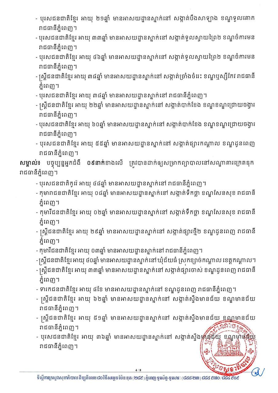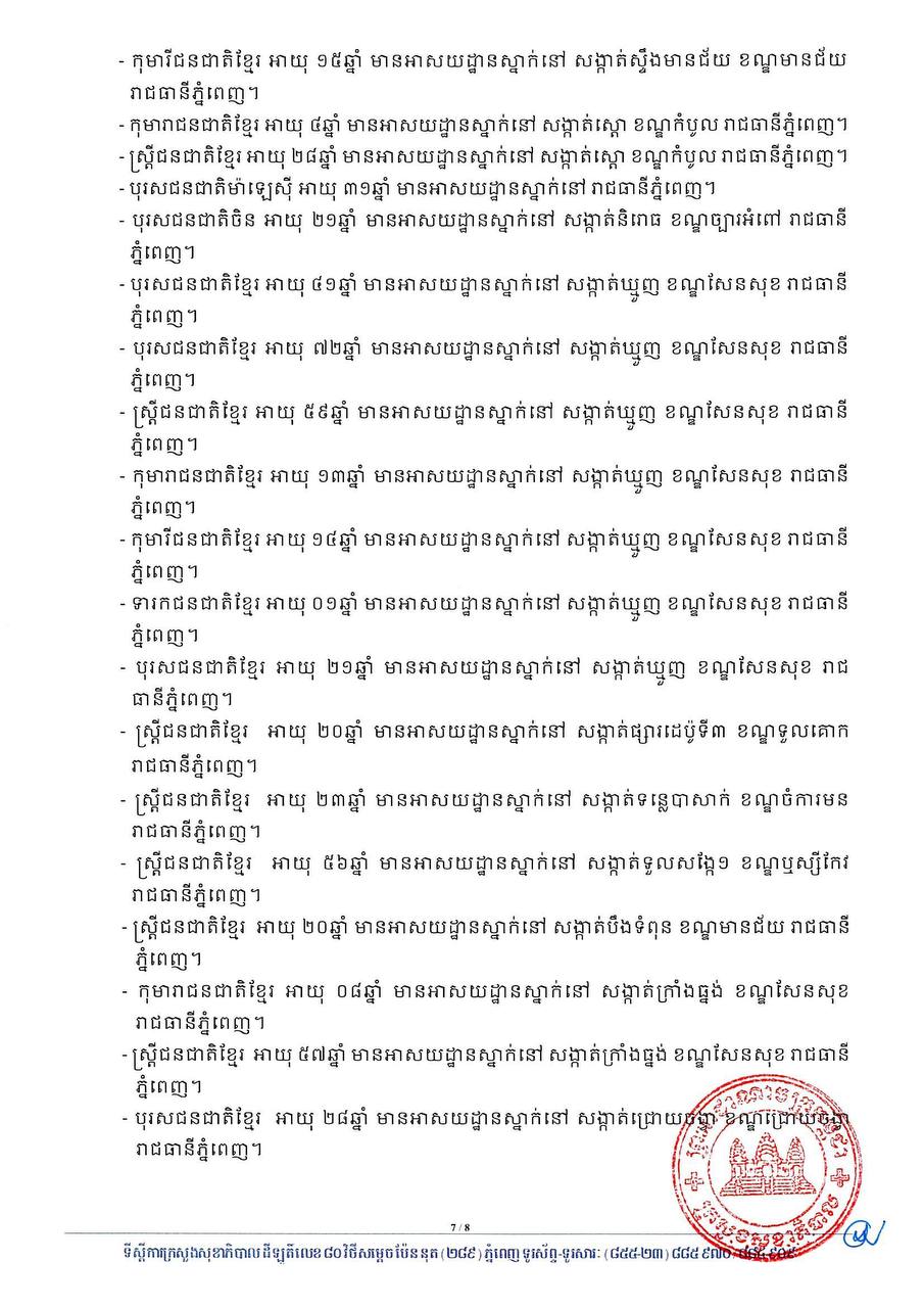 ៤- ទារជនជាតិខ្មែរ អាយុ ០៨ខែ មានអាសយដ្ឋានស្នាក់នៅ ខណ្ឌដូនពេញ រាជធានីភ្នំពេញ។
