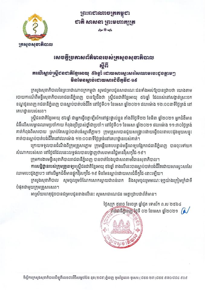 យោងតាមសេចក្តីប្រកាសព័ត៌មានរបស់ក្រសួងសុខាភិបាលនៅរសៀលថ្ងៃទី០២ ខែមេសា ឆ្នាំ២០២១ មុននេះបន្តិចបានអោយដឹងថា ស្ត្រីវ័យ៥៦ឆ្នាំម្នាក់ ដែលរស់នៅសង្កាត់ស្រះចក ខណ្ឌដូនពេញ រាជធានីភ្នំពេញ បានស្លាប់បាត់បង់ជីវិត នៅថ្ងៃទី០១ ខែមេសា ឆ្នាំ២០២១ នៅវេលាម៉ោង ១២:០០នាទីថ្ងៃត្រង់ នៅគេហដ្ឋានរបស់សព។