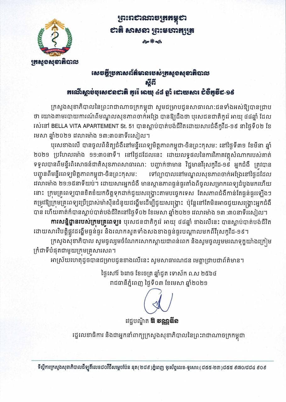 នៅរសៀលថ្ងៃទី០៣ ខែមេសា ឆ្នាំ២០២១ ក្រសួងសុខាភិបាលបានចេញសេចក្តីជូនព័ត៌មានមួយស្តីពីការស្លាប់អ្នកជំងឺជនជាតិកូរ៉េ ម្នាក់អាយុ៤៨ឆ្នាំ ដោយសារជំងឺកូវីដ-១៩ នៅមណ្ឌលសុខភាពចាក់អង្រែ កាលពីថ្ងៃទី០២ ខែមេសា ឆ្នាំ២០២១ នៅវេលាម៉ោង១៣:៣០នាទីរសៀល។
