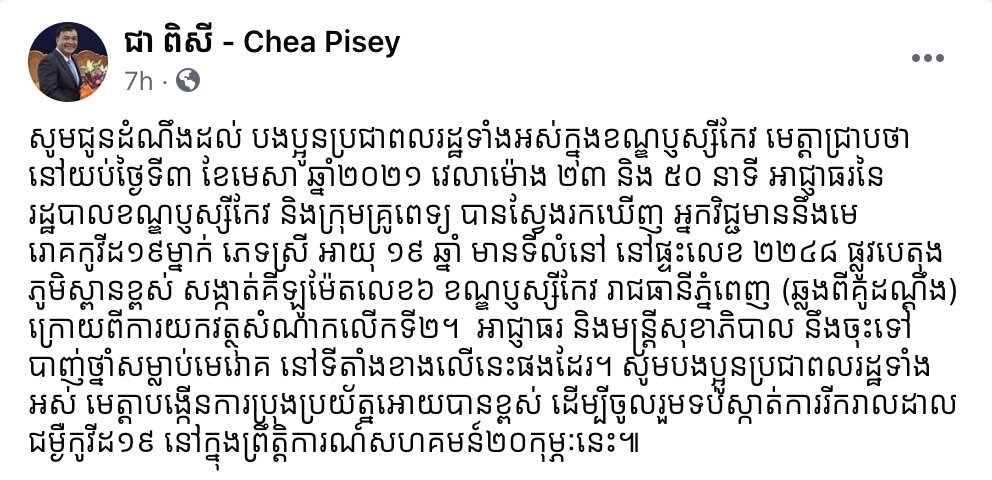 យោងតាមការបញ្ជាក់ពីលោក ជា ពិសី អភិបាលនៃគណៈអភិបាលខណ្ឌប្ញស្សីកែវ បានឲ្យដឹងនៅលើបណ្តាញសង្គមហ្វេសប៊ុកថា សូមជូនដំណឹងដល់ បងប្អូនប្រជាពលរដ្ឋទាំងអស់ក្នុងខណ្ឌប្ញស្សីកែវ មេត្តាជ្រាបថា នៅយប់ថ្ងៃទី៣ ខែមេសា ឆ្នាំ២០២១ វេលាម៉ោង ២៣ និង ៥០ នាទី អាជ្ញាធរនៃរដ្ឋបាលខណ្ឌប្ញស្សីកែវ និងក្រុមគ្រូពេទ្យ បានស្វែងរកឃើញ អ្នកវិជ្ជមាននឹងមេរោគកូវីដ១៩ម្នាក់ ភេទស្រី អាយុ ១៩ ឆ្នាំ មានទីលំនៅ នៅផ្ទះលេខ ២២៤៨ ផ្លូវបេតុង ភូមិស្ពានខ្ពស់ សង្កាត់គីឡូម៉ែតលេខ៦ ខណ្ឌប្ញស្សីកែវ រាជធានីភ្នំពេញ (ឆ្លងពីគូដណ្ដឹង) ក្រោយពីការយកវត្ថុសំណាកលើកទី២។